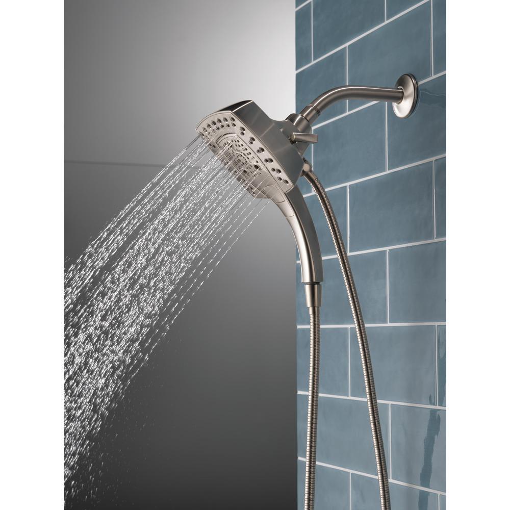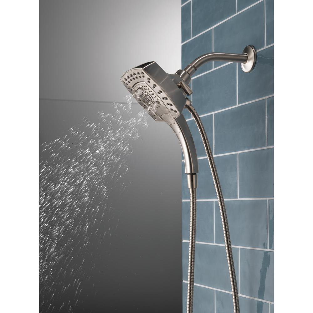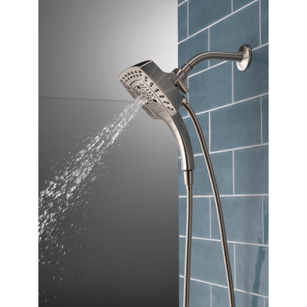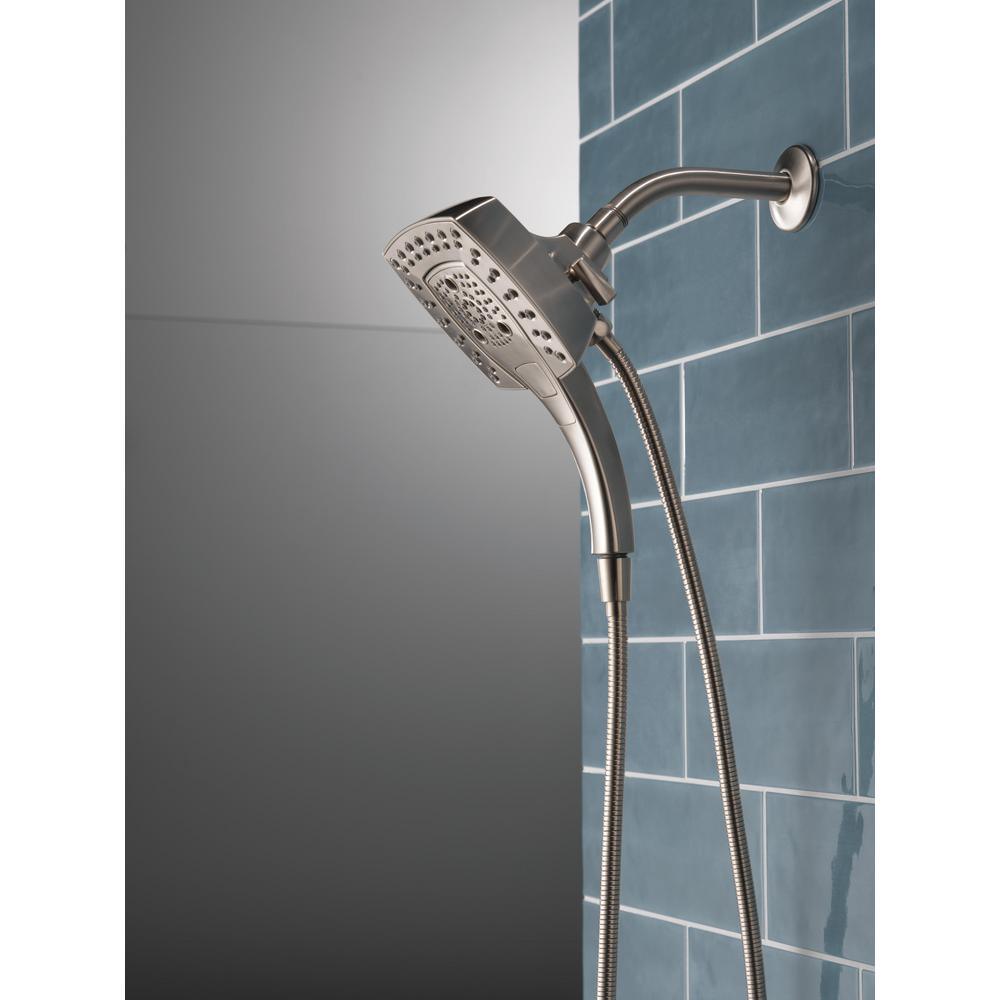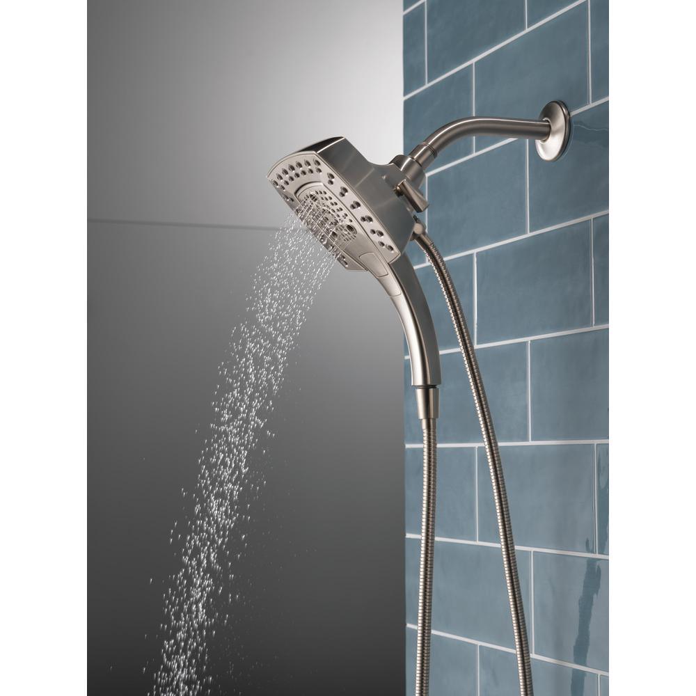 The In2ition Two-in-One Shower features a detachable hand shower which can be used separately from or simultaneously with the shower head. This integrated dual-functionality gives you maximum flexibility without sacrificing warmth, as you can choose to have water streaming from the shower head only, the hand shower only or both the shower head and hand shower at once. Delta H2Okinetic Power Drench Showers look different because they are different. H2Okinetic showers are powered by an innovative technology that sculpts the water into a unique wave pattern, giving you the feeling of more water without using more water and creating a shower with more warmth, coverage and intensity. So go ahead and indulge, because now you can enjoy the feeling of more water without using more water. While other products may gather unsightly mineral build-up over time, Delta soft rubber Touch-Clean spray holes allow any mineral residue to simply be wiped away for an instantly refreshed look with no need for soaking or the aid of chemical cleaners. The pause setting gives you ample space for shaving, lathering and other shower tasks, without worrying about overspray or water waste. This spray setting helps you conserve water, so you can worry less about depleting your supply of hot water - and you help the environment too.