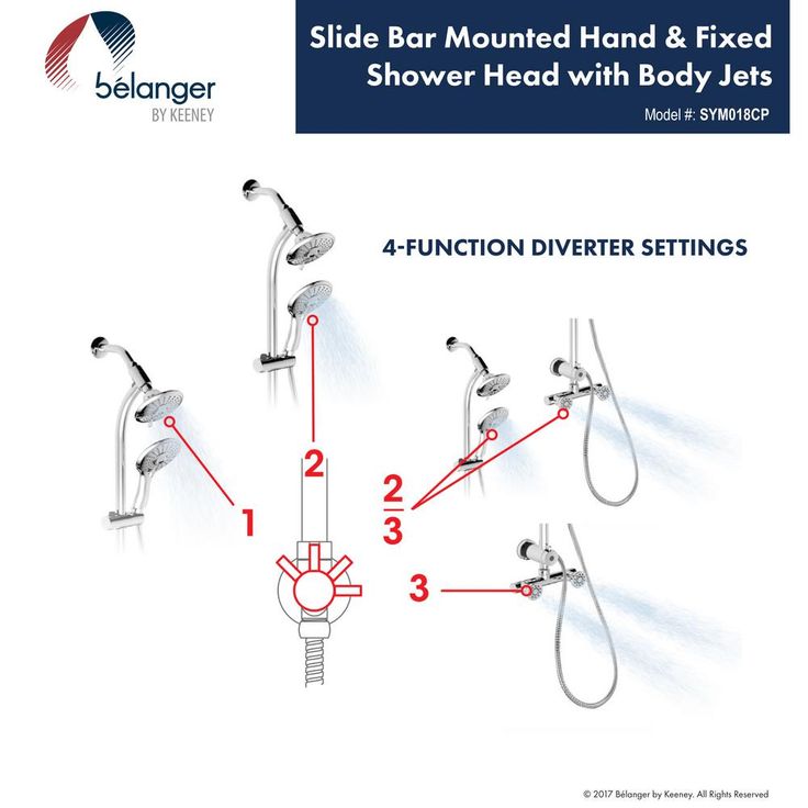 The Symphony collection is an exclusive bathroom collection with various options to reshape your shower experience. The Symphony 018 Shower Kit provides affordable luxury with a sleek, modern design and long-lasting durability. Featuring a swivel showerhead and adjustable hand shower, the SYM018CP retrofit design is intended to fit an existing shower arm. This kit offers two options for drill-free installation fixing with a suction cup or adhesive so it is ideal for upgrading an existing unit. The shower head and hand shower have two water flows (spray or massage) and three positions with soft, easy-to-clean nozzles. A four-function diverter allows single use of the shower heads, body jets, or hand shower and body jets combined for an optimal bath experience. The kit includes a showerhead, slide bar with a multi-function hand shower, four-function diverter, two body jets, and 59 in. metal flexible hose. You can install with confidence knowing Belanger by KEENEY products are backed by a Limited Lifetime Warranty.
