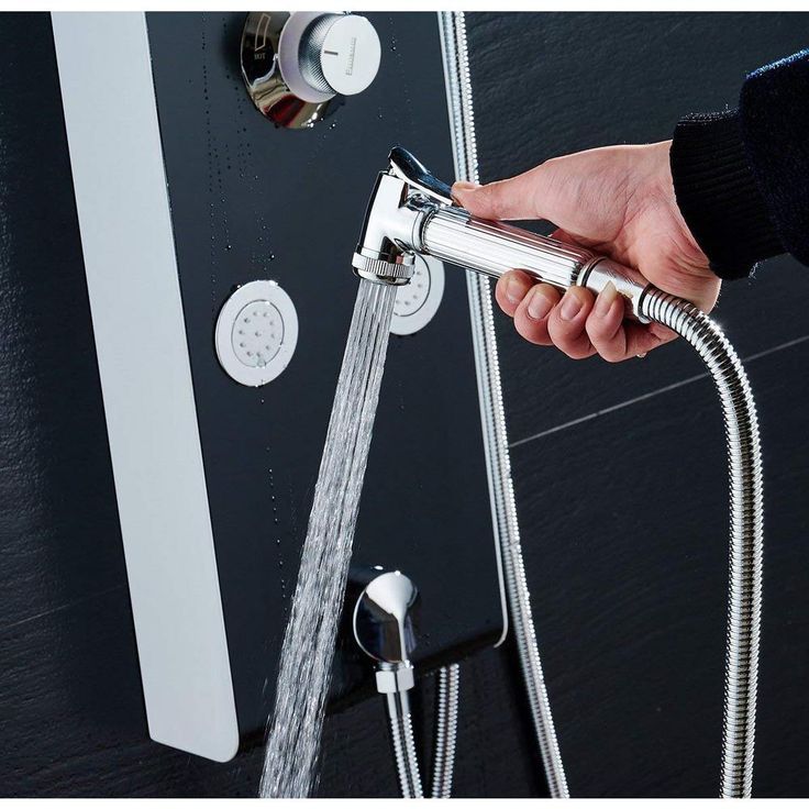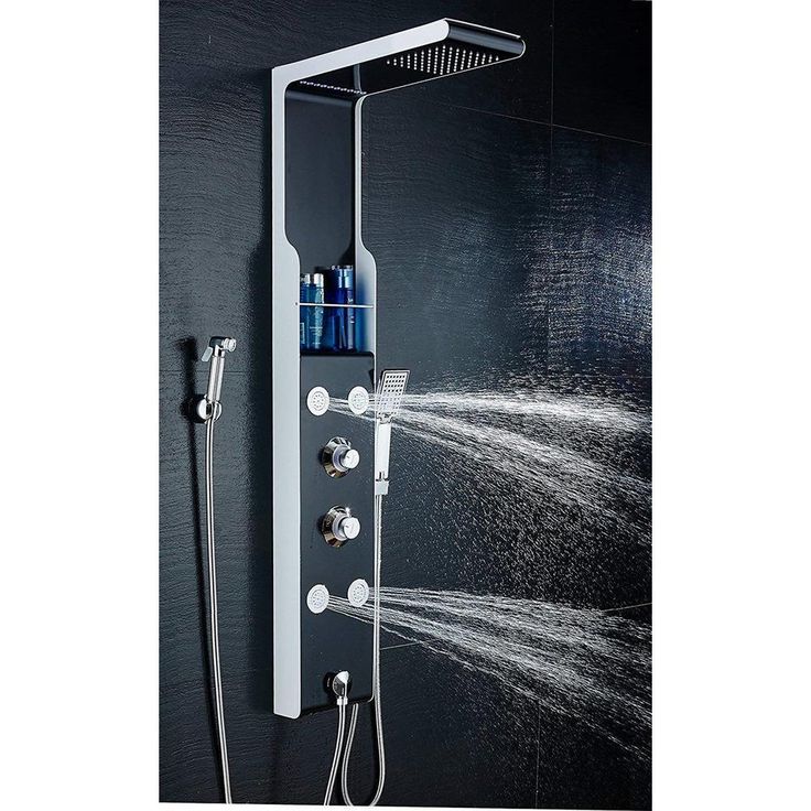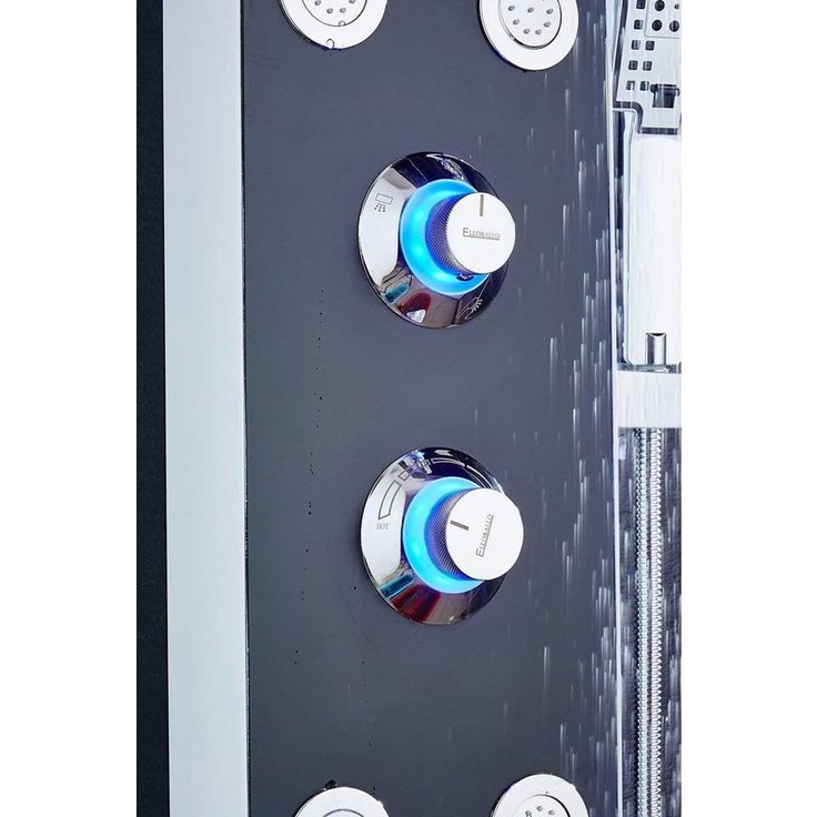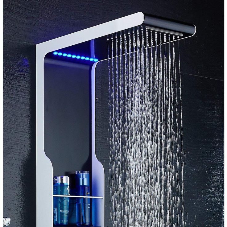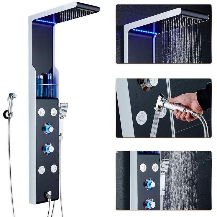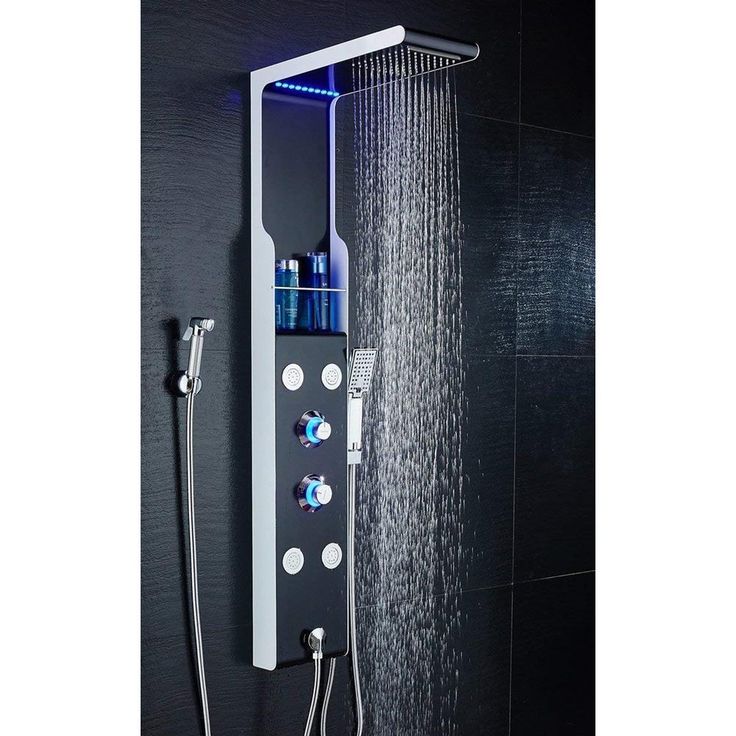 • Luxury shower panel has built-in LED temperature display, LED overhead rainfall showerhead, adjustable high-powered body massage jets, tub spout and high-efficiency multi-function handheld shower wand
