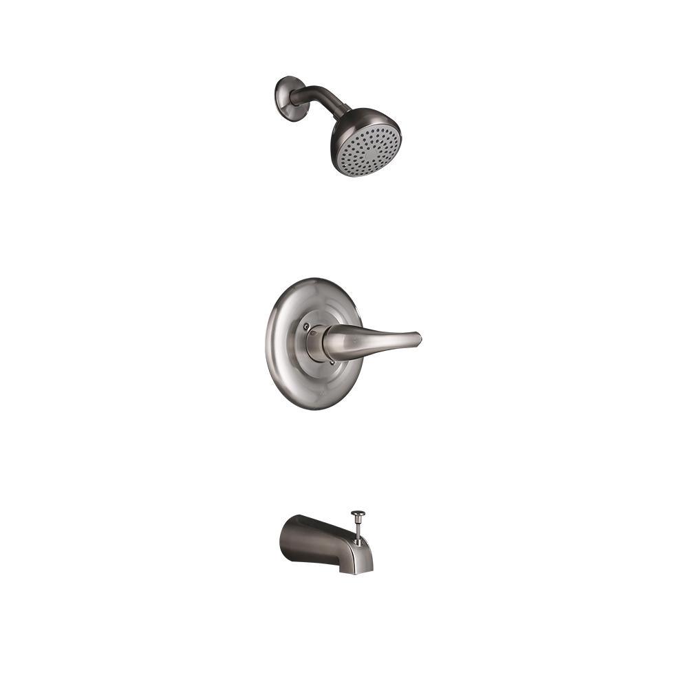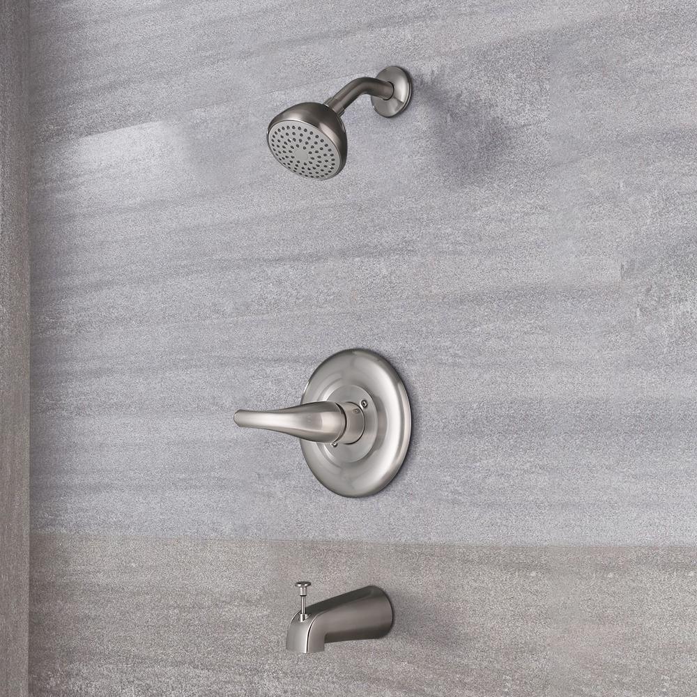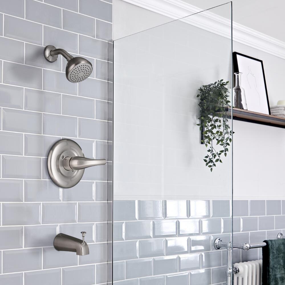• Elegant brushed nickel finish and sleek look shower system complements any decor