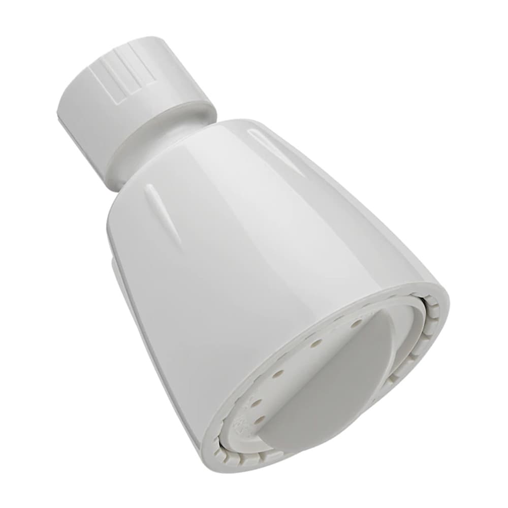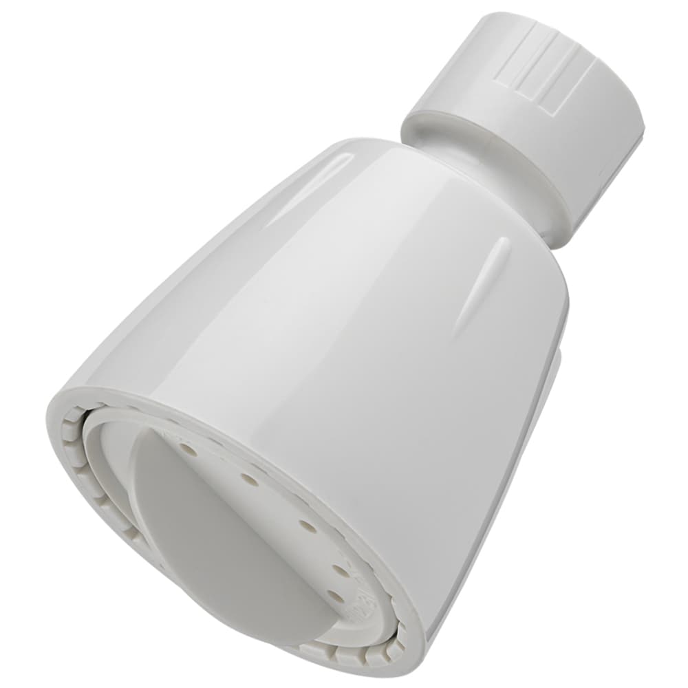 Simple, single-function shower head delivering a full spray at 2.5 GPM. Installs easily on any standard 1/2-in shower arm and features a compact 2-in round design in white plastic.