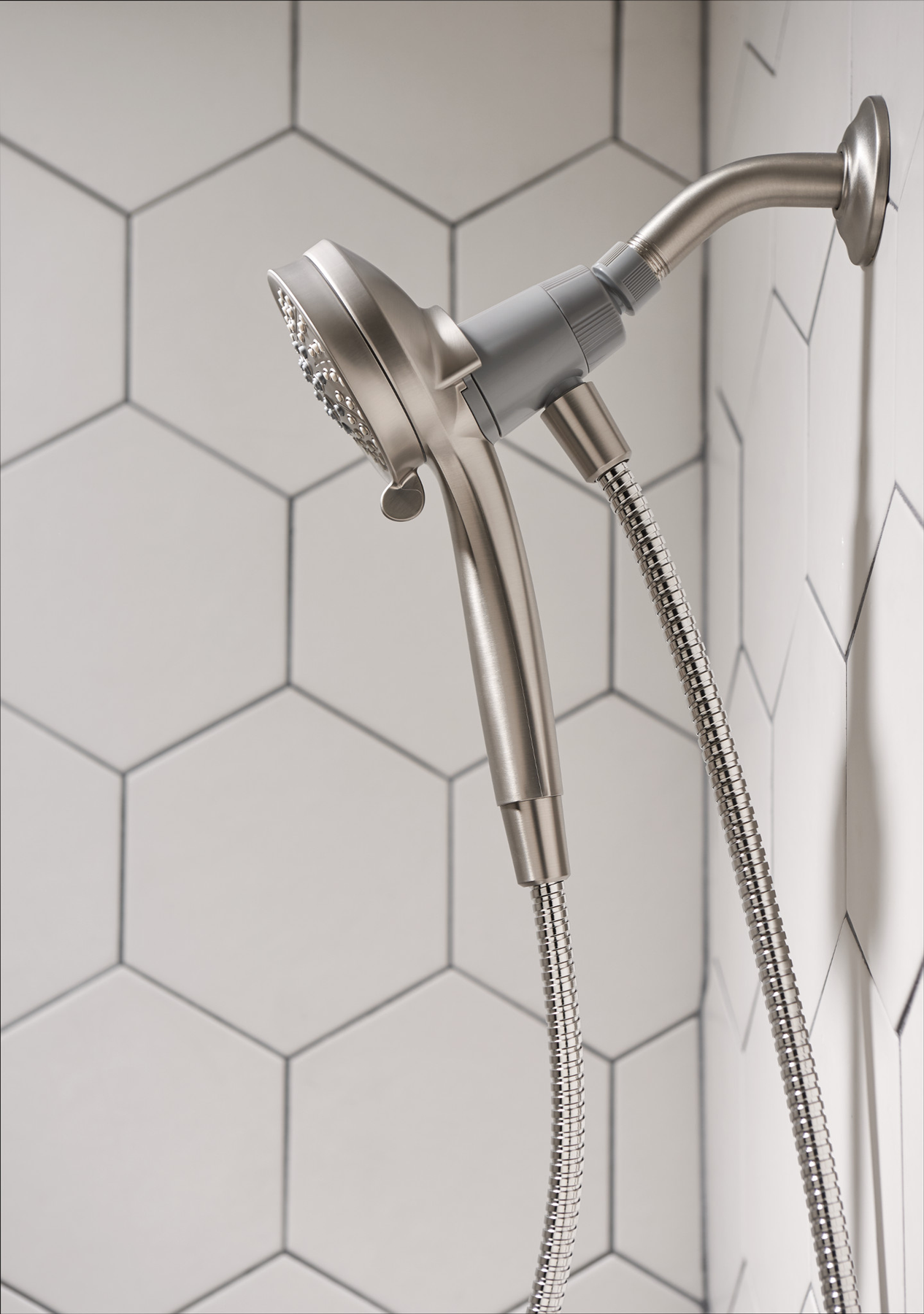 A sleek, sculptural handshower with intuitive magnetism