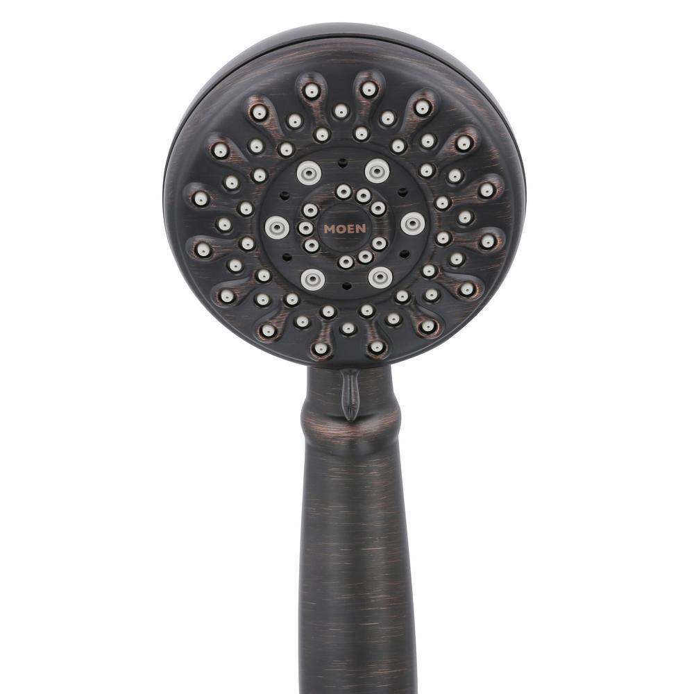 Upgrade your bath with the MOEN Banbury handheld shower head featuring five spray settings and a 4-inch face for versatile coverage. The Mediterranean Bronze finish adds a warm, antiqued look while the 60 in. hose provides extended reach for easy rinsing and cleaning.