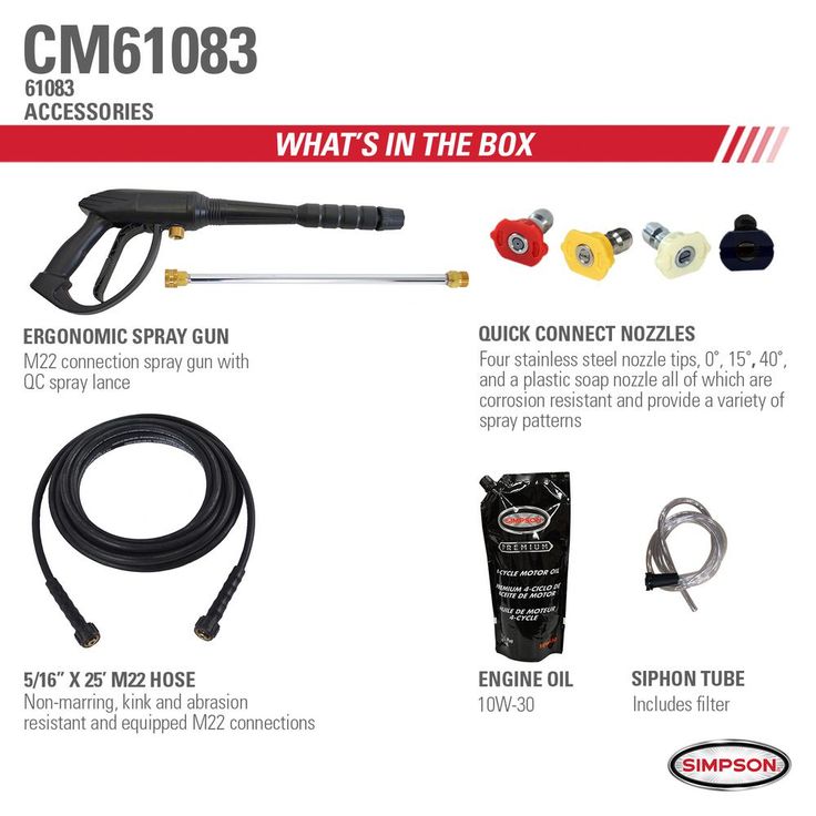 Clean big with the Clean Machine by Simpson. This fully assembled compact gas pressure washer is lightweight, easy to store and provides a powerful pressure washing experience. Just setup and you are ready to clean. The Clean Machine features a Simpson OHV engine paired with an OEM Technologies axial cam pump. The fully assembled pressure washer steel frame is powder coated for corrosion resistance and features a fold down handle that allows for quick and convenient storage, taking up minimal storage in tight spaces. This compact gas pressure washer will allow easy access into hard to clean areas.
