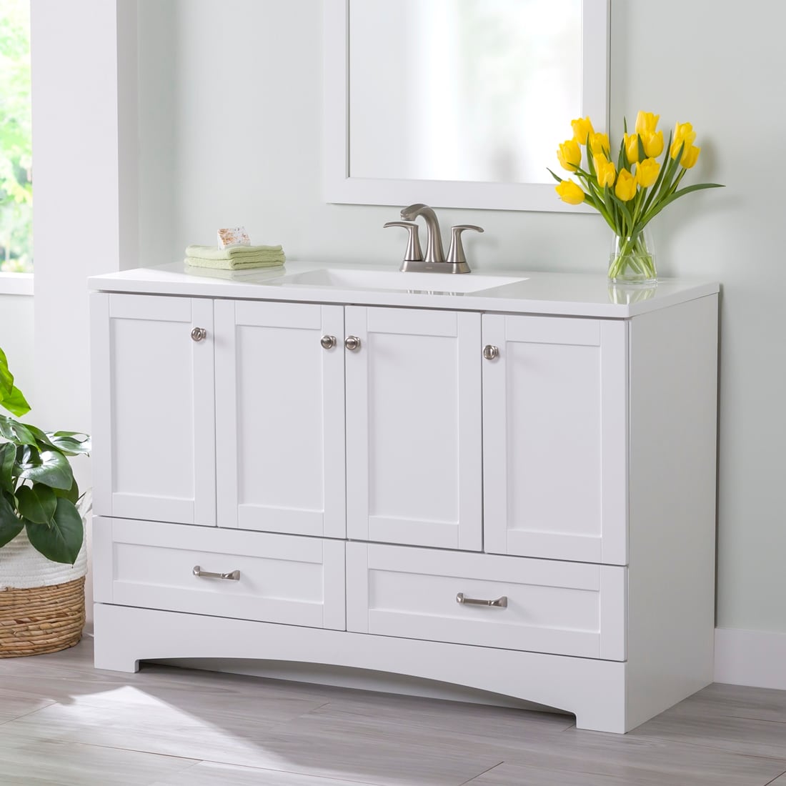 Shaker-style freestanding vanity in a soft white finish paired with a durable white cultured marble top and integrated rectangular sink. Pre-assembled engineered wood cabinet features ample storage with dual side cabinets, a 2-door center, and two full-extension bottom drawers for easy organization.