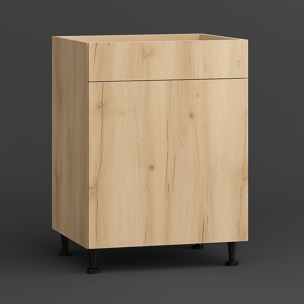 The Cambridge Radiance Sink Base Cabinet combines modern design with practical functionality. Featuring a Light Oak Laminate finish and frameless construction, this cabinet is ready-to-assemble and perfect for enhancing your kitchen's style and storage.