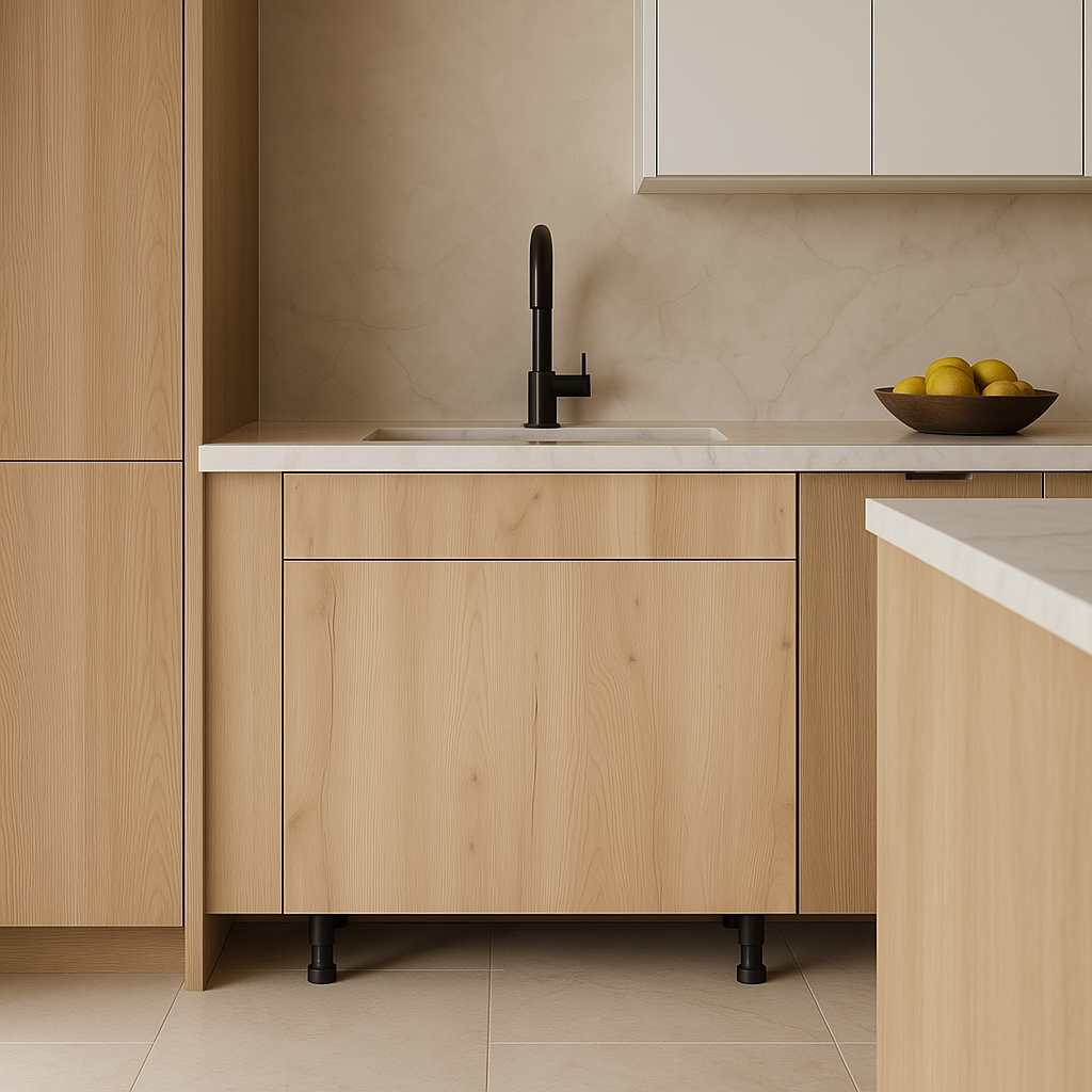 The Cambridge Radiance Sink Base Cabinet combines modern design with practical functionality. Featuring a Light Oak Laminate finish and soft-close mechanisms, this ready-to-assemble cabinet is perfect for enhancing your kitchen's style and usability.