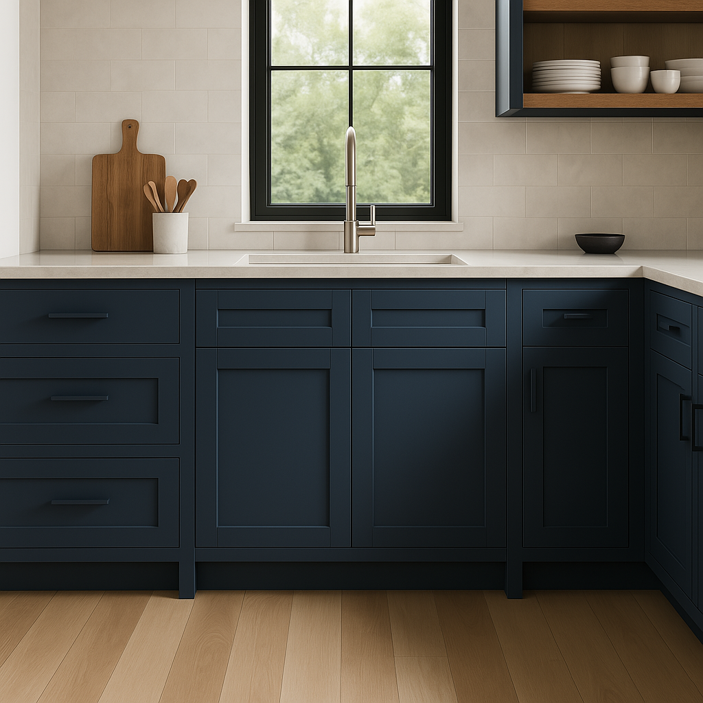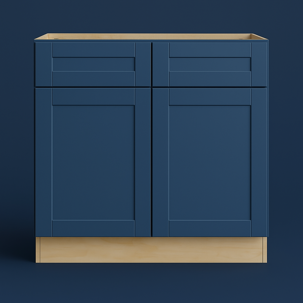 The MILL'S PRIDE Valencia Blue Sink Base Cabinet combines elegant shaker-style design with durable plywood construction. Featuring a deep blue thermofoil finish and soft-close doors, this cabinet is perfect for modern kitchens.