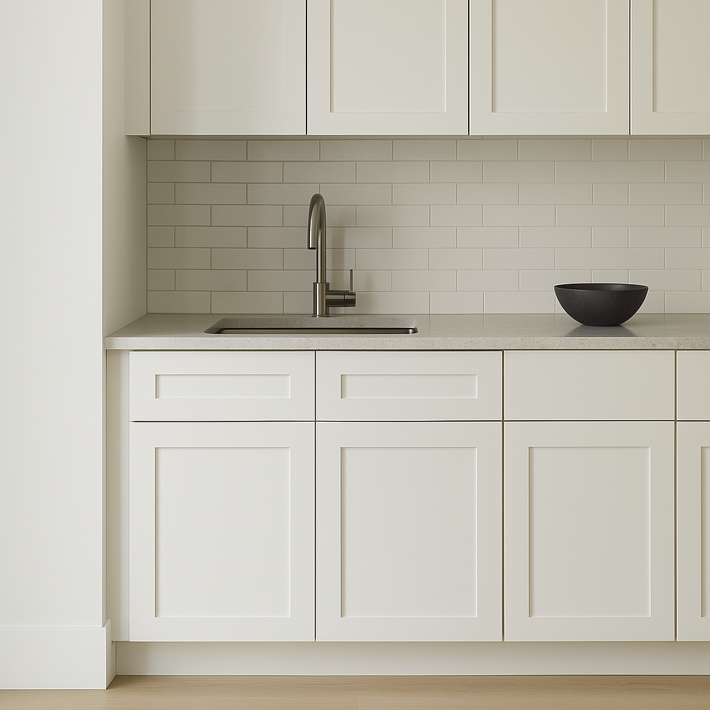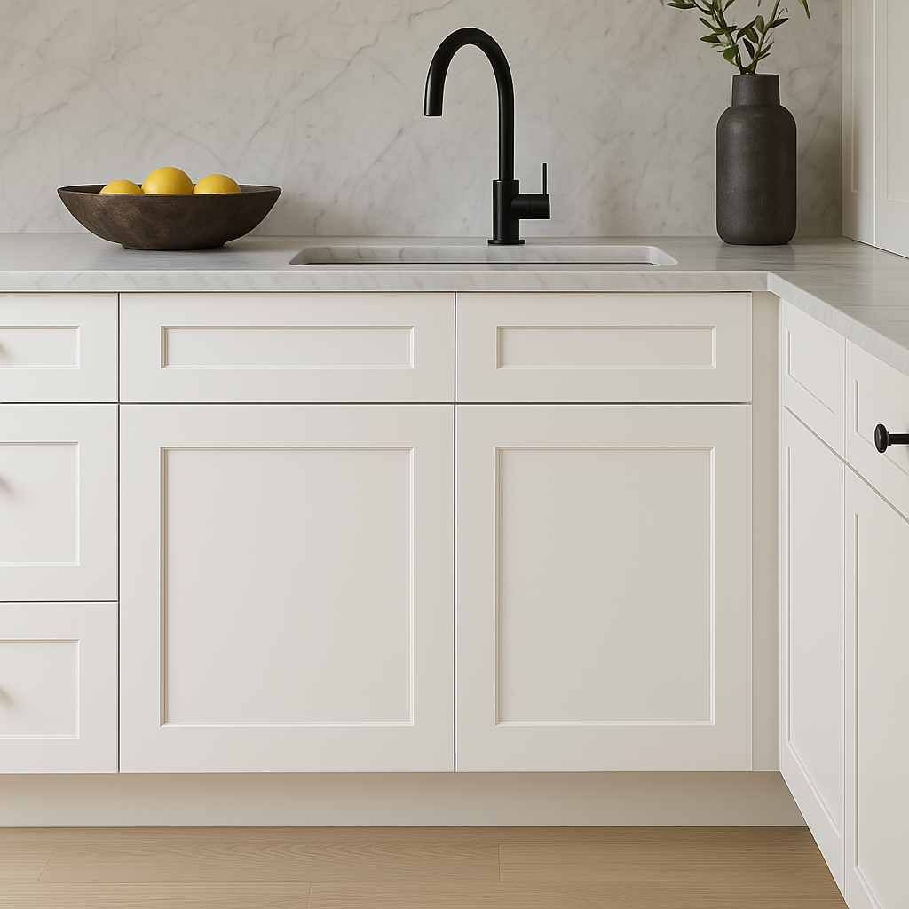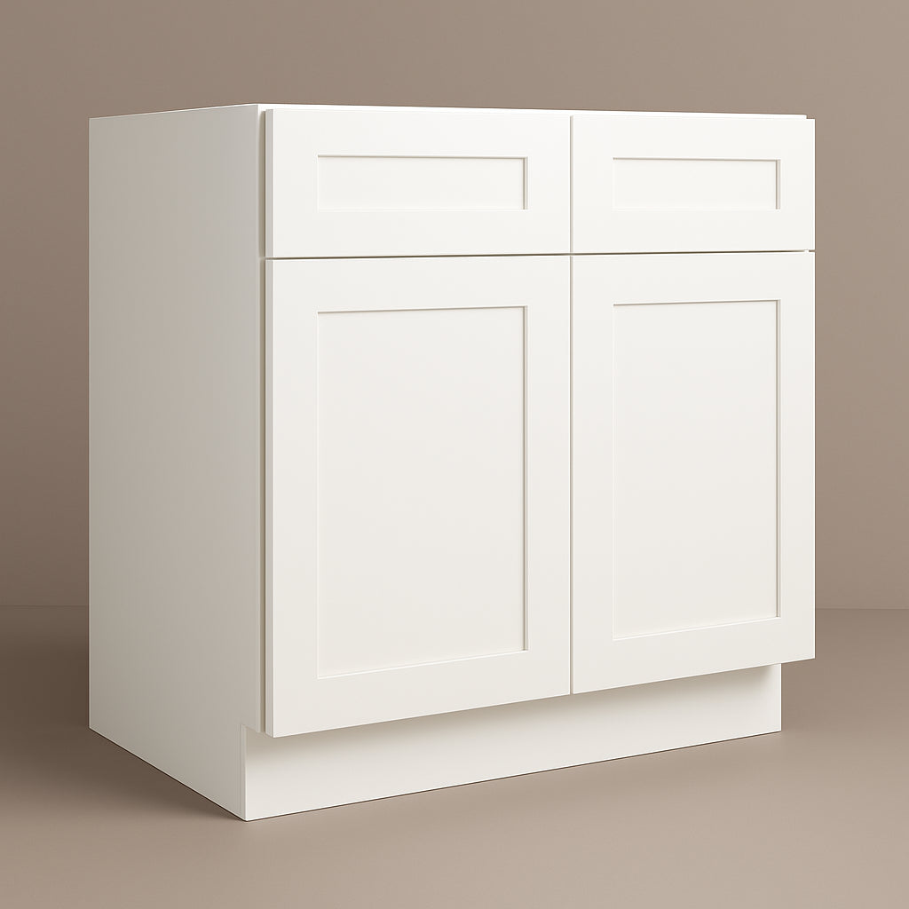 The Plywell Shaker Sink Base Cabinet offers a blend of elegance and durability, featuring solid wood doors and frames, soft-close functionality, and a painted finish. Designed for easy assembly, this cabinet is perfect for modern kitchens.