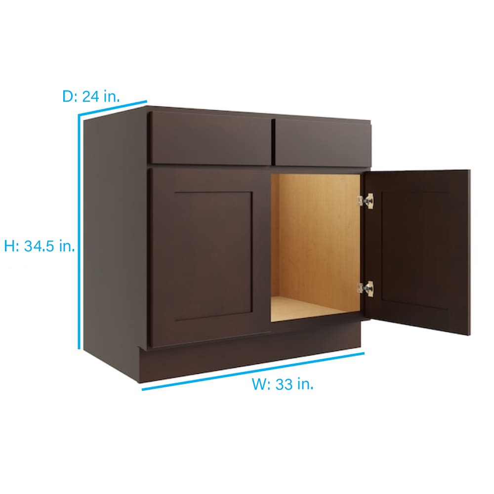 The RELIABILT Parkstone 33-inch Espresso Sink Base Cabinet combines practical design with elegant style, perfect for enhancing kitchens or utility spaces. Fully assembled and crafted from plywood, it features a smooth stained exterior and a soft-close feature for quiet luxury. CARB II compliant and offering a limited lifetime warranty, it's a reliable choice for any home project.