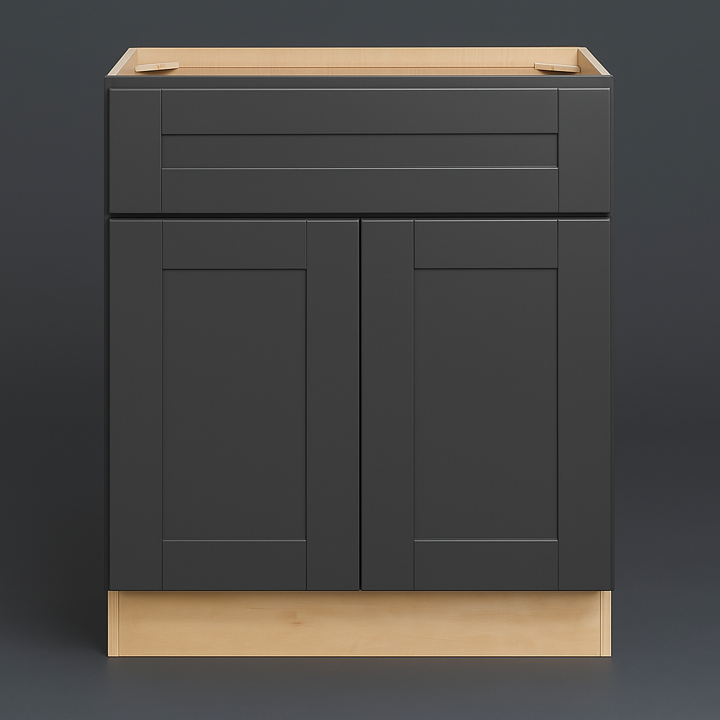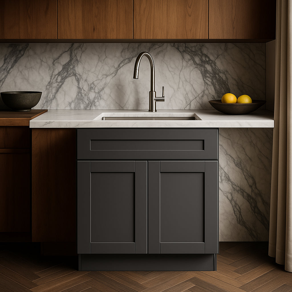 The Richmond Venetian Onyx Sink Base Cabinet by MILL'S PRIDE combines elegant shaker design with durable plywood construction. Featuring a dark gray thermofoil finish and soft-close doors, this cabinet is perfect for modern kitchens.