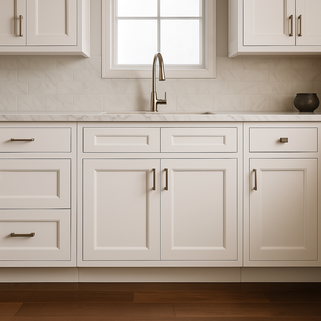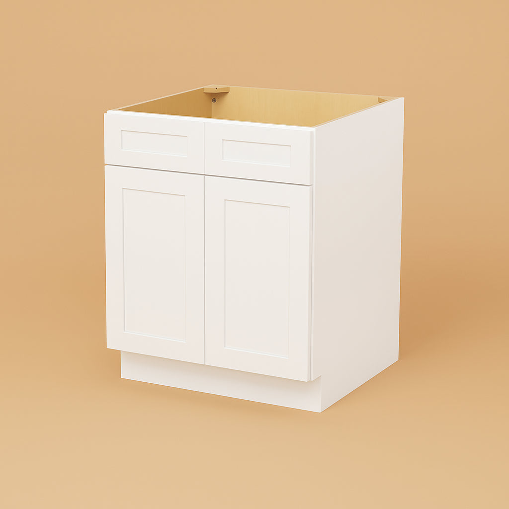 The RoomyLife Shaker White Sink Base Cabinet combines solid wood craftsmanship with a sleek painted finish, offering durability and style for your kitchen. Its easy-to-assemble design and soft-close doors make it a practical and elegant choice.