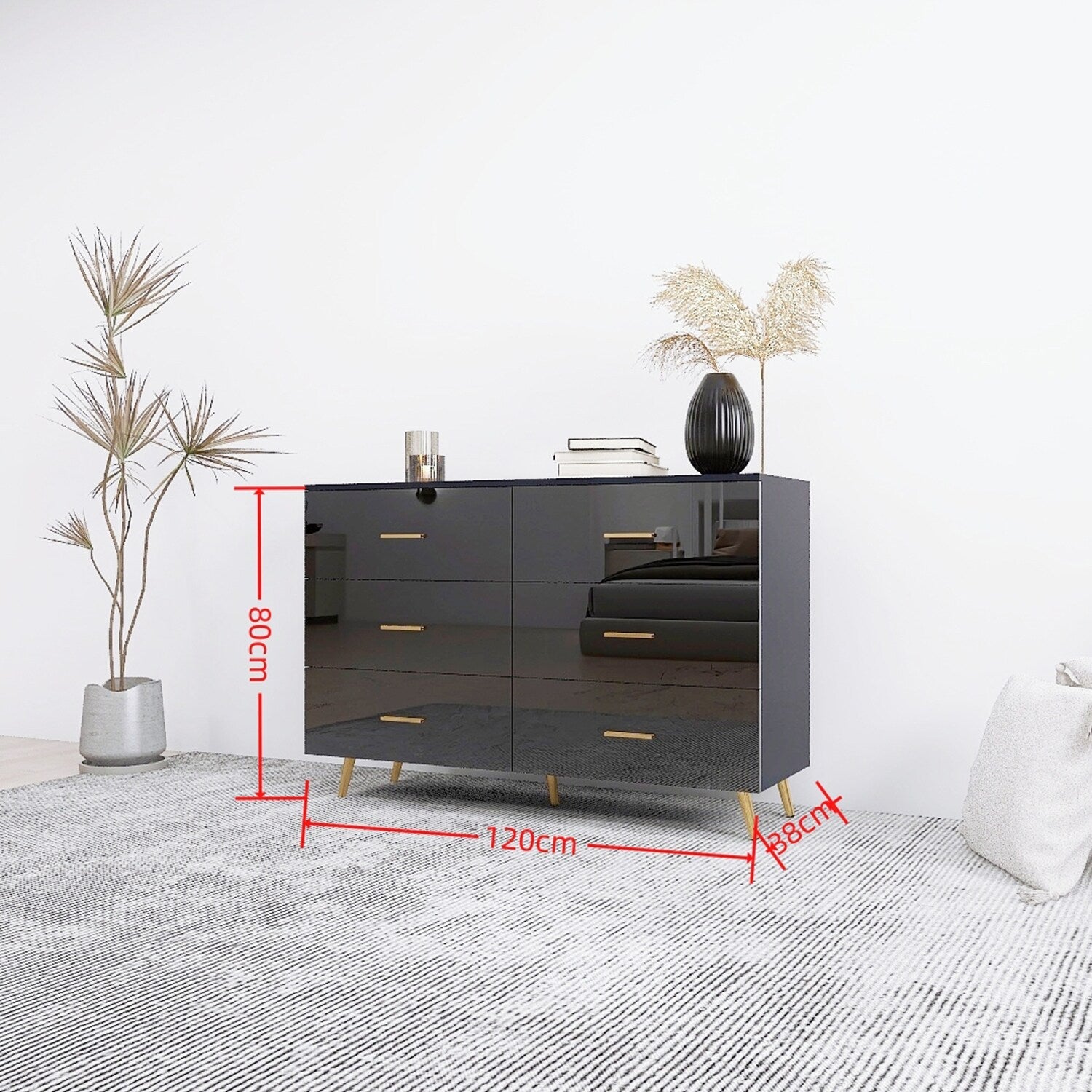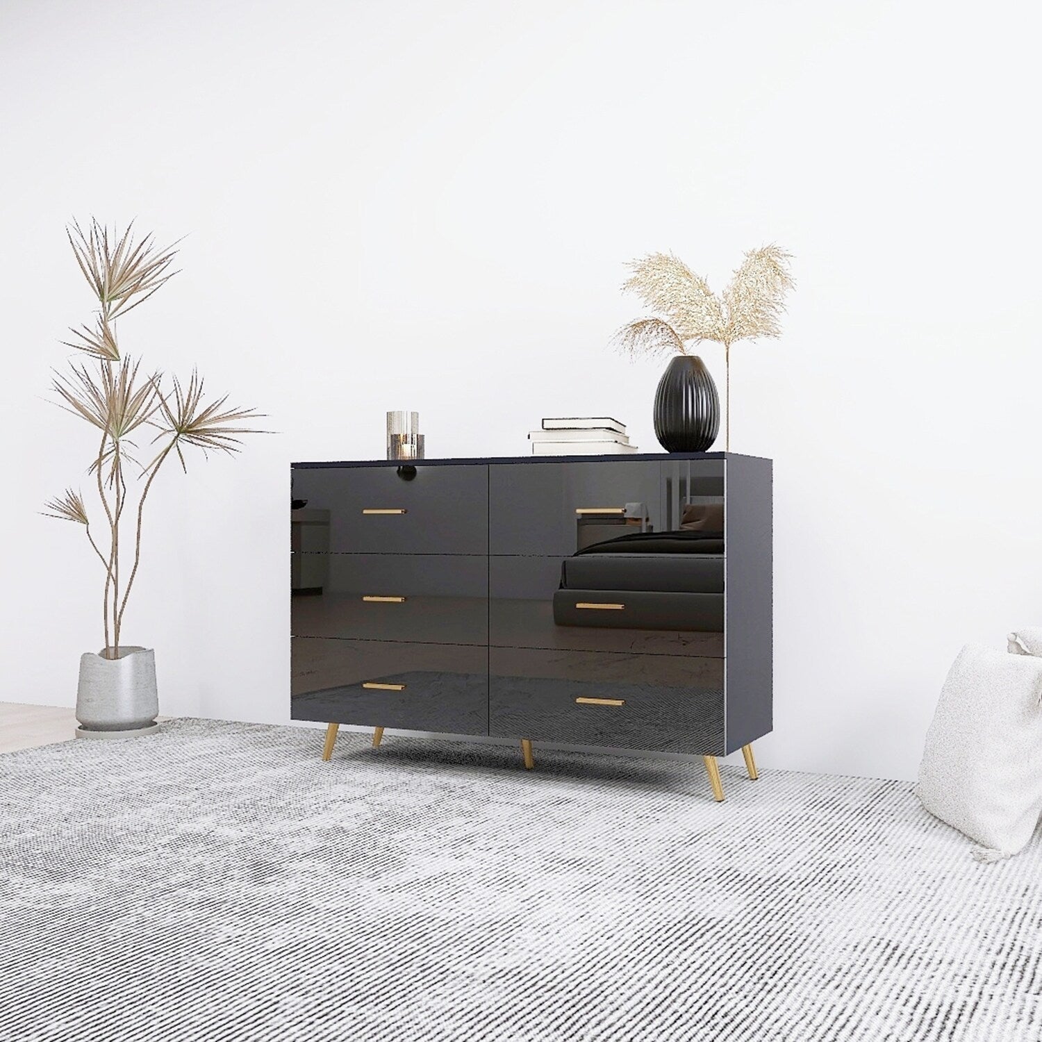 SINOFURN Contemporary Black Wood 6-Drawer Dresser with Golden Handles and Legs