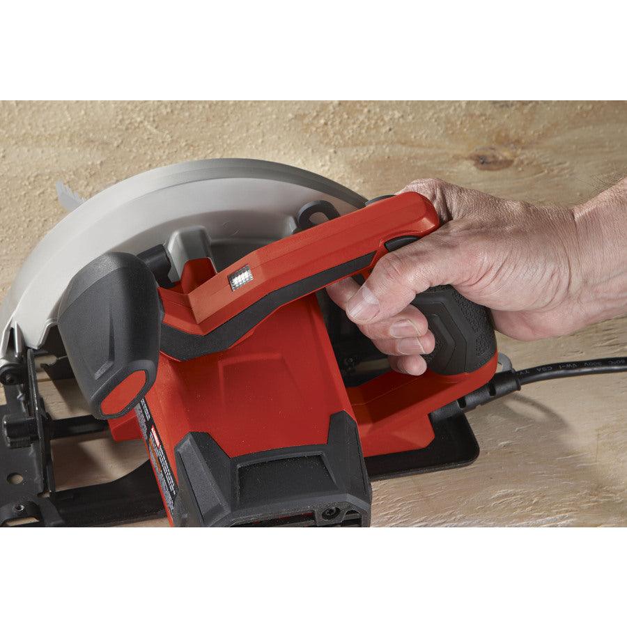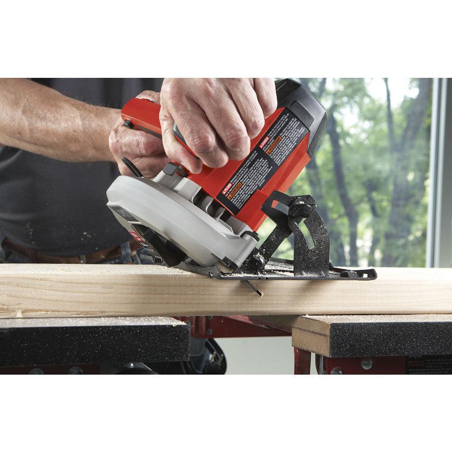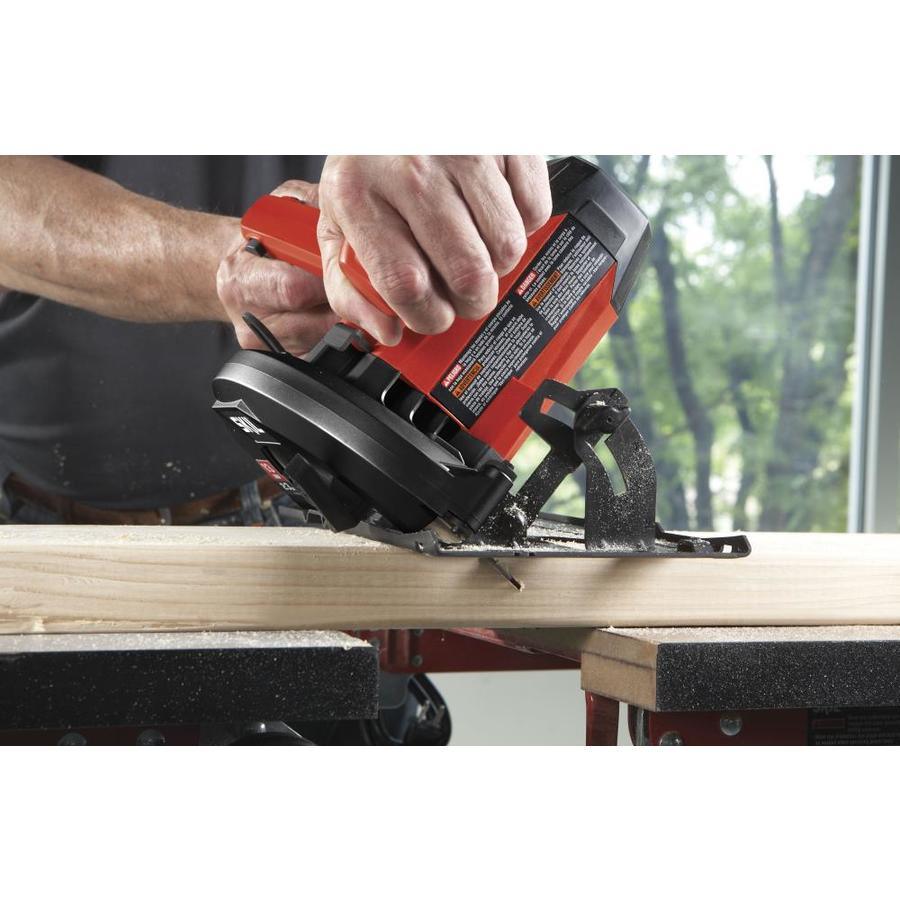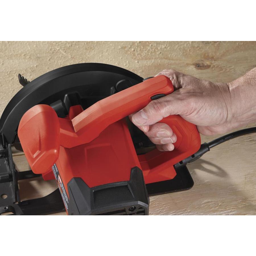 Powerful 13-amp motor delivers 5,300-RPM for greater speed and faster cuts 7-1/4-in carbide-tipped blade included 51 ° bevel capacity, with positive stop at 45 °, for a wide variety of cuts Lightweight 6.95-lb design reduces fatigue Dust blower keeps line-of-cut free of sawdust for improved visibility Spindle lock to assist in easy blade changes 2-point line of sight helps you cut straight lines with ease Safety lock/guarded trigger minimizes accidental starts Rear lever depth adjustment quickly assures your desired depth of cut