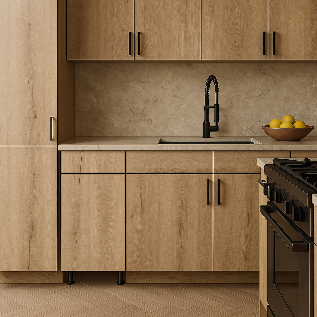 The Cambridge Radiance kitchen cabinet offers a sleek, frameless design with a Light Oak Laminate finish, adjustable shelves, and soft-close features for a modern and functional kitchen upgrade.