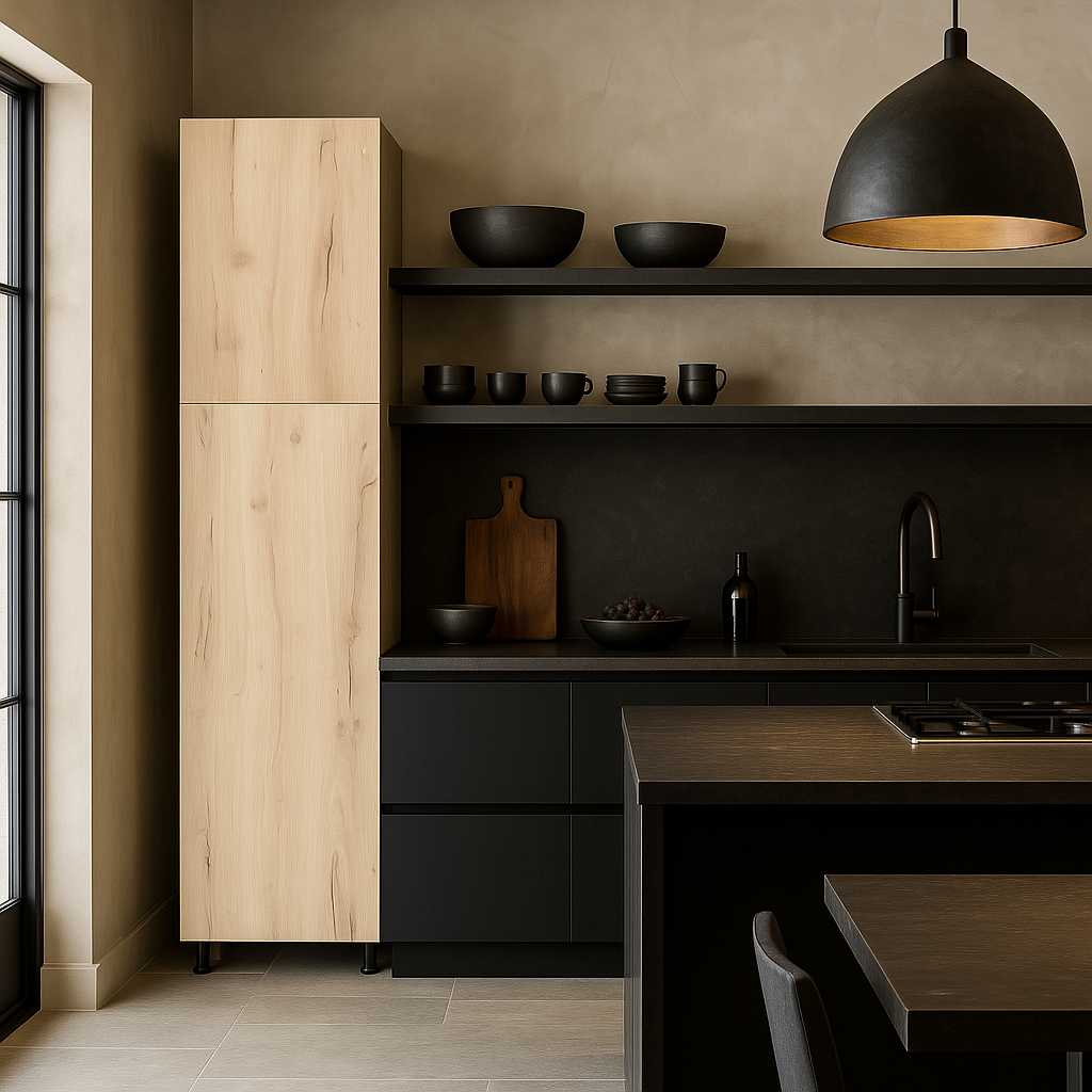 The Cambridge Radiance Pantry Cabinet combines modern design with practical functionality. Featuring a Light Oak laminate finish, adjustable shelves, and soft-close doors, this ready-to-assemble cabinet is perfect for enhancing your kitchen's storage and style.