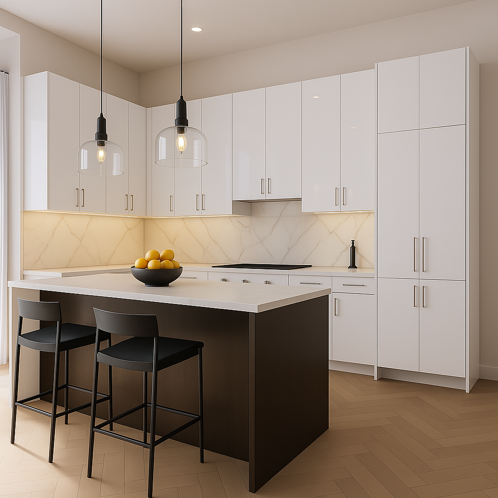 The Cambridge Radiance kitchen cabinet combines modern design with practical features, including adjustable shelves and soft-close doors. Its high-gloss white finish and frameless construction make it a stylish and durable choice for any kitchen.