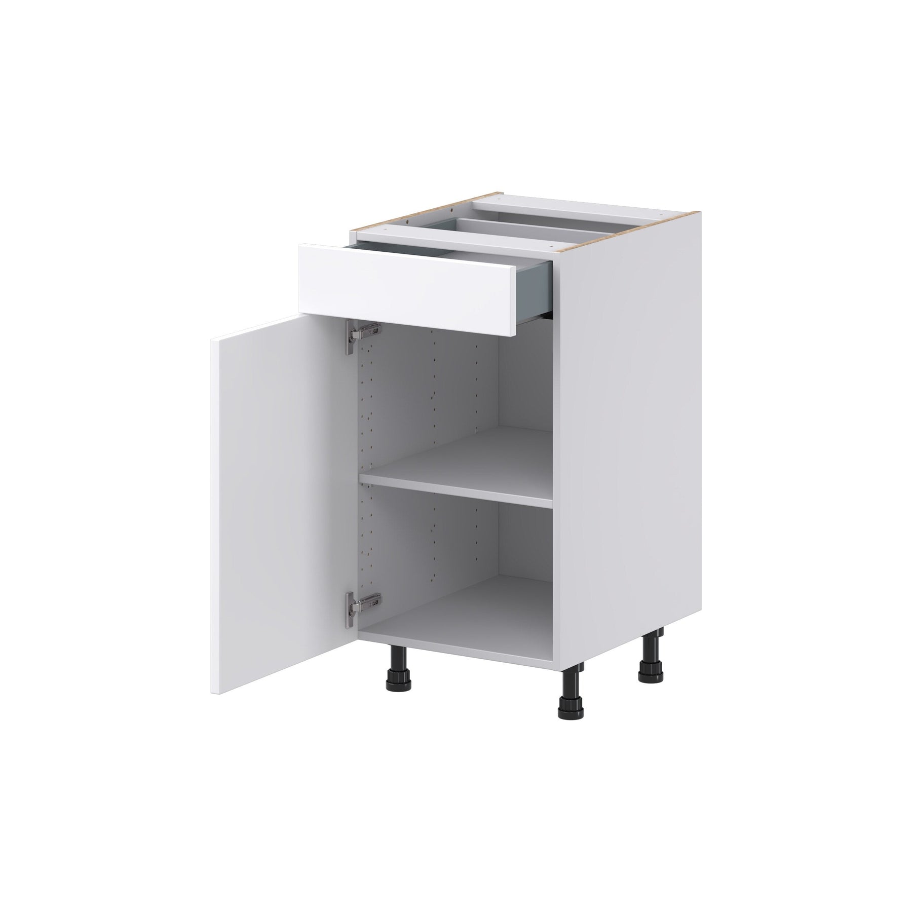 Upgrade your kitchen or bathroom with the Hugo&Borg Lasalle Bright White 1-Drawer Base Cabinet. This fully assembled cabinet features a sleek, modern flat-panel slab door style, complete with soft-close metal drawers and a durable, moisture-resistant melamine finish. Designed for easy installation, this cabinet provides exceptional storage solutions for any space.