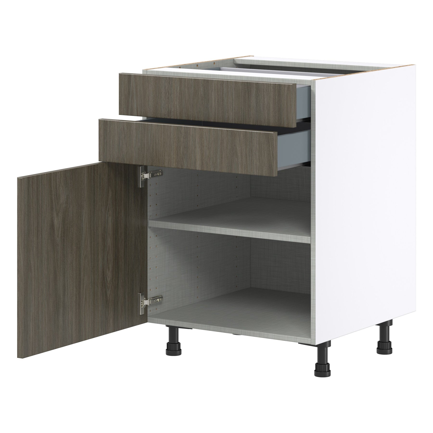The Savane 24-inch Textmel 2-Drawer Base Cabinet by Hugo&Borg offers modern style with superior functionality for your kitchen or storage space. Its two soft-close drawers and European-style construction give you an impressive 20% more storage, while the textured melamine finish ensures durability and elegance.