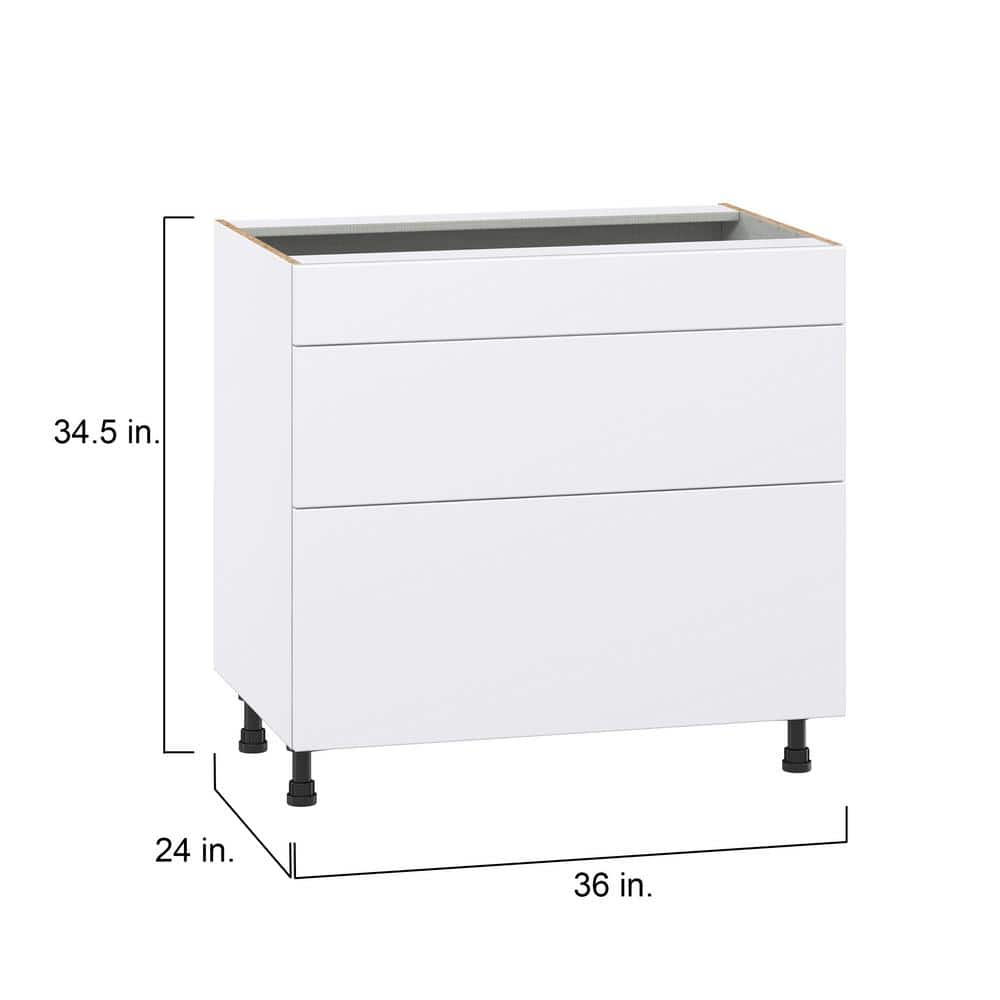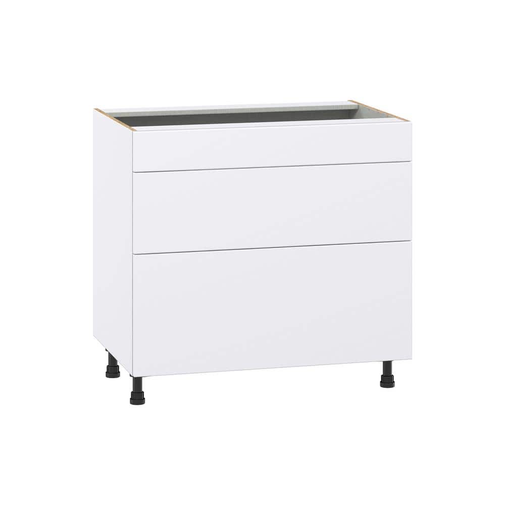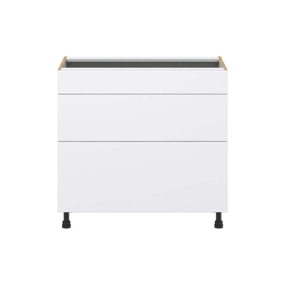 The J COLLECTION Fairhope Bright White Slab Base Kitchen Cabinet combines contemporary style with practical function to offer a modern yet timeless addition to your kitchen. With its full-access design, soft-close drawers, and pre-installed adjustable legs, this cabinet provides a blend of elegance and convenience for easy installation and optimal organization.