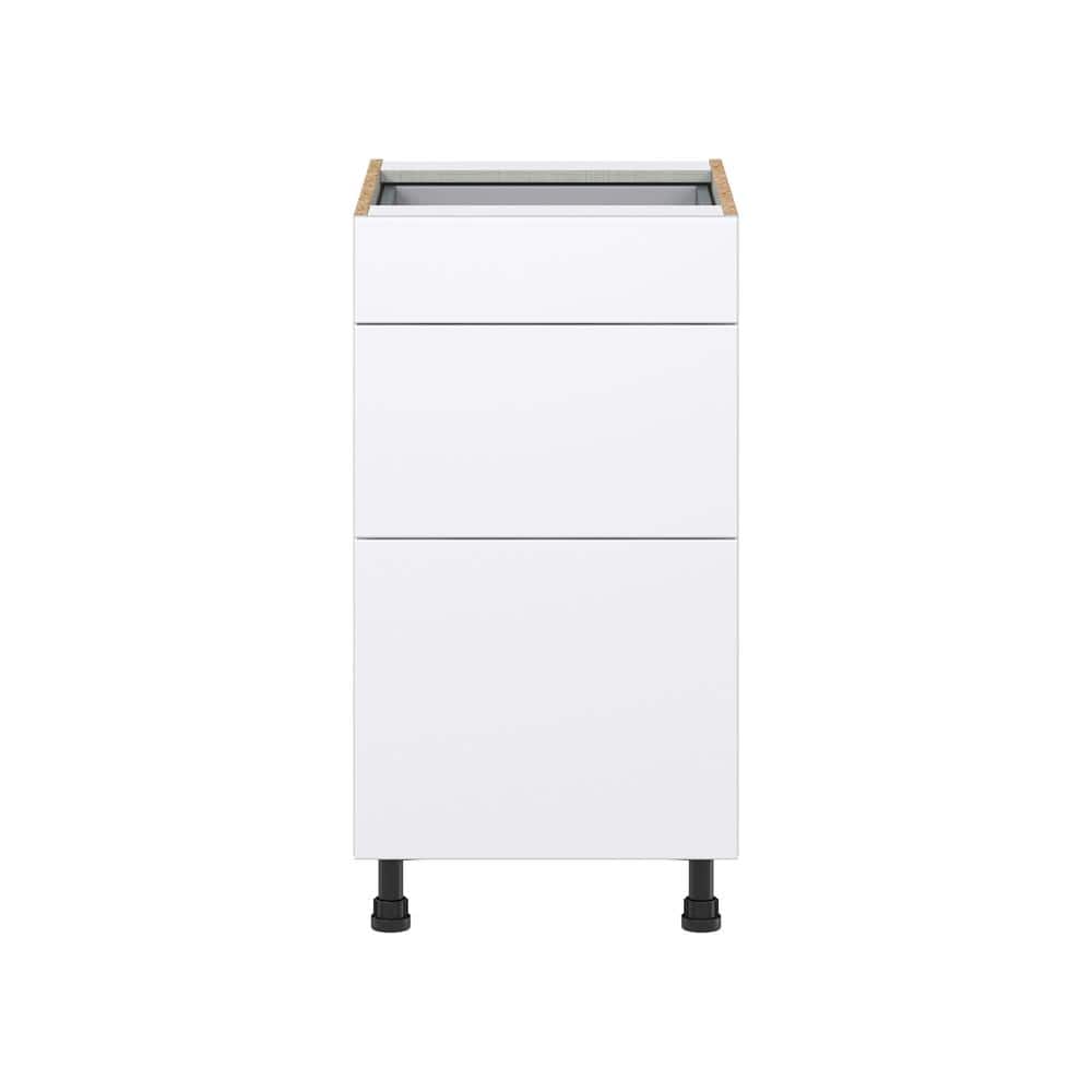Enhance your kitchen's elegance and functionality with the J Collection Bright White 3-Drawer Base Cabinet—order now for an easy installation and timeless design.