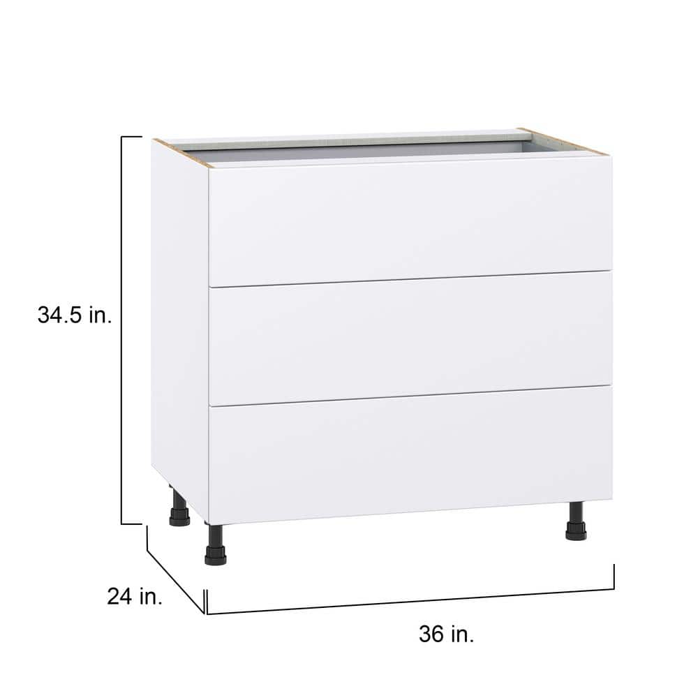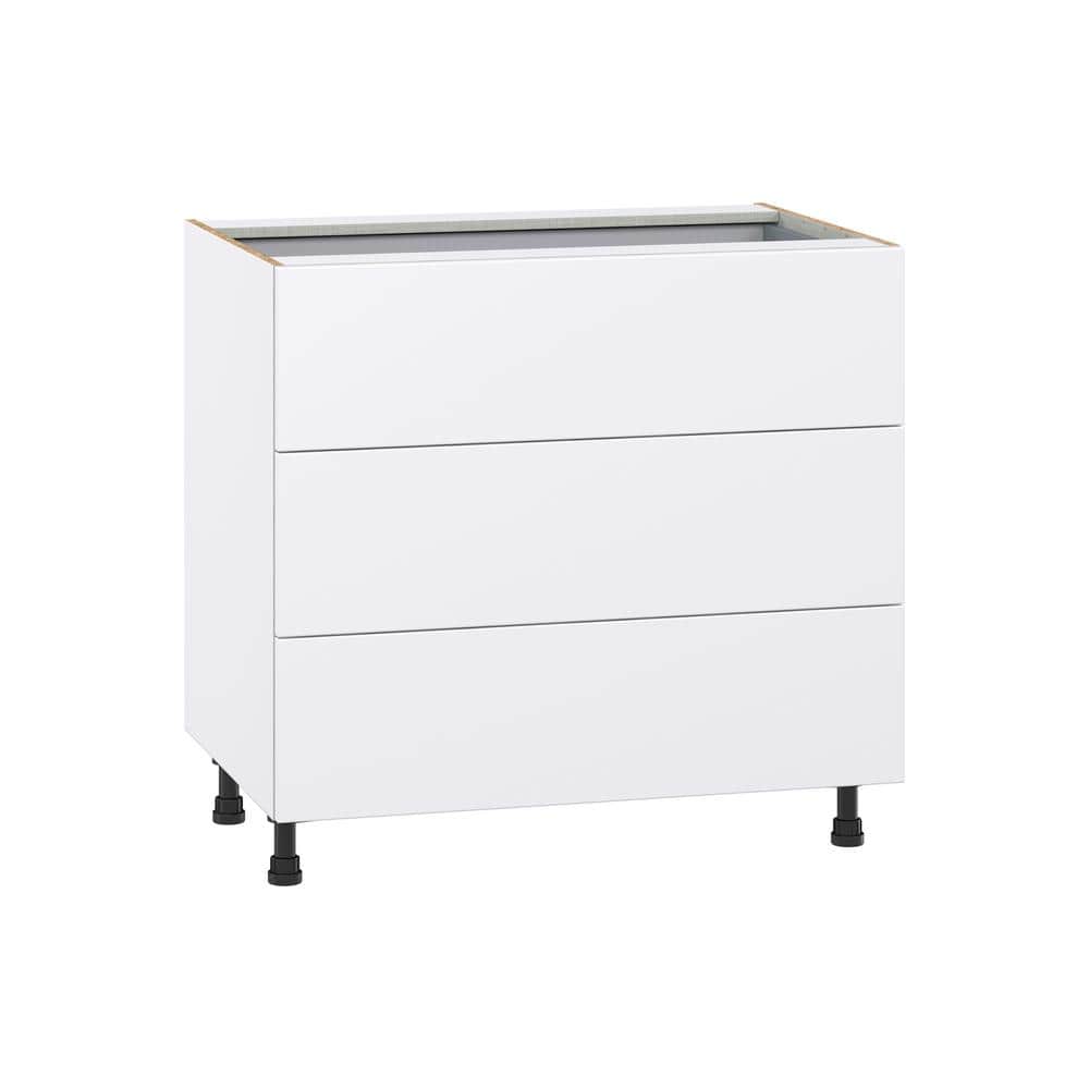 Elevate your kitchen with the J COLLECTION Fairhope bright white cabinet, designed with a sleek, frameless style for a modern look. This 36-inch base cabinet features four spacious drawers with soft-close functionality, providing effortless access and stress-free organization. Built for durability, its furniture board construction ensures longevity while the pre-attached adjustable legs simplify installation and leveling.