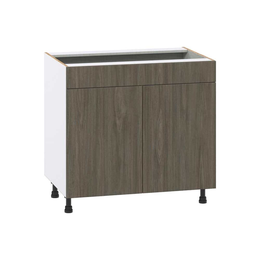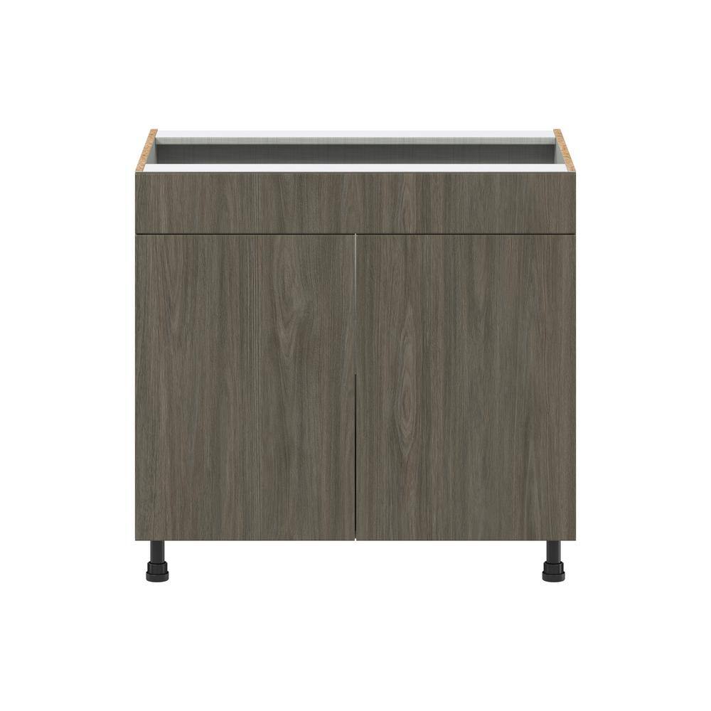 The J COLLECTION Medora Base Kitchen Cabinet is the perfect blend of style and functionality for modern kitchens. Featuring a sleek textured walnut finish, this fully assembled cabinet boasts a frameless design that offers easy access to all your kitchen essentials. With chip-resistant durability and soft close hinges, it's crafted to enhance both the aesthetic and utility of your kitchen space.