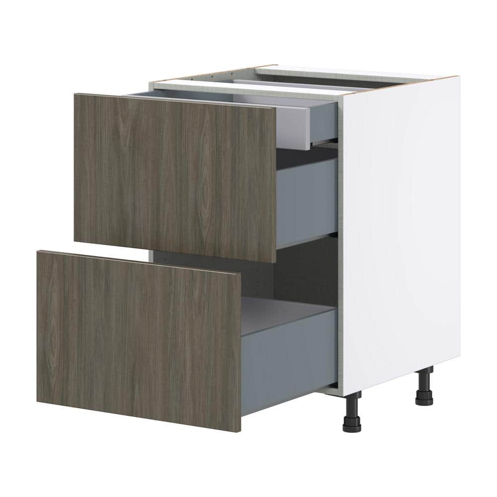 Elevate your kitchen aesthetics with the J COLLECTION Medora Walnut Base Cabinet. Featuring a sleek, modern frameless design, this cabinet delivers both style and functionality. Its durable construction and sophisticated walnut finish promise a long-lasting, chic kitchen solution.