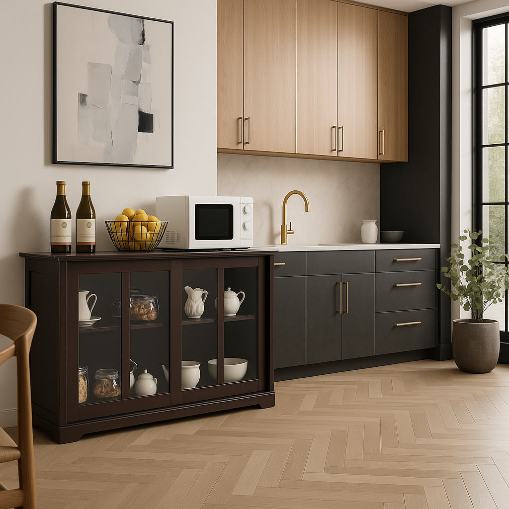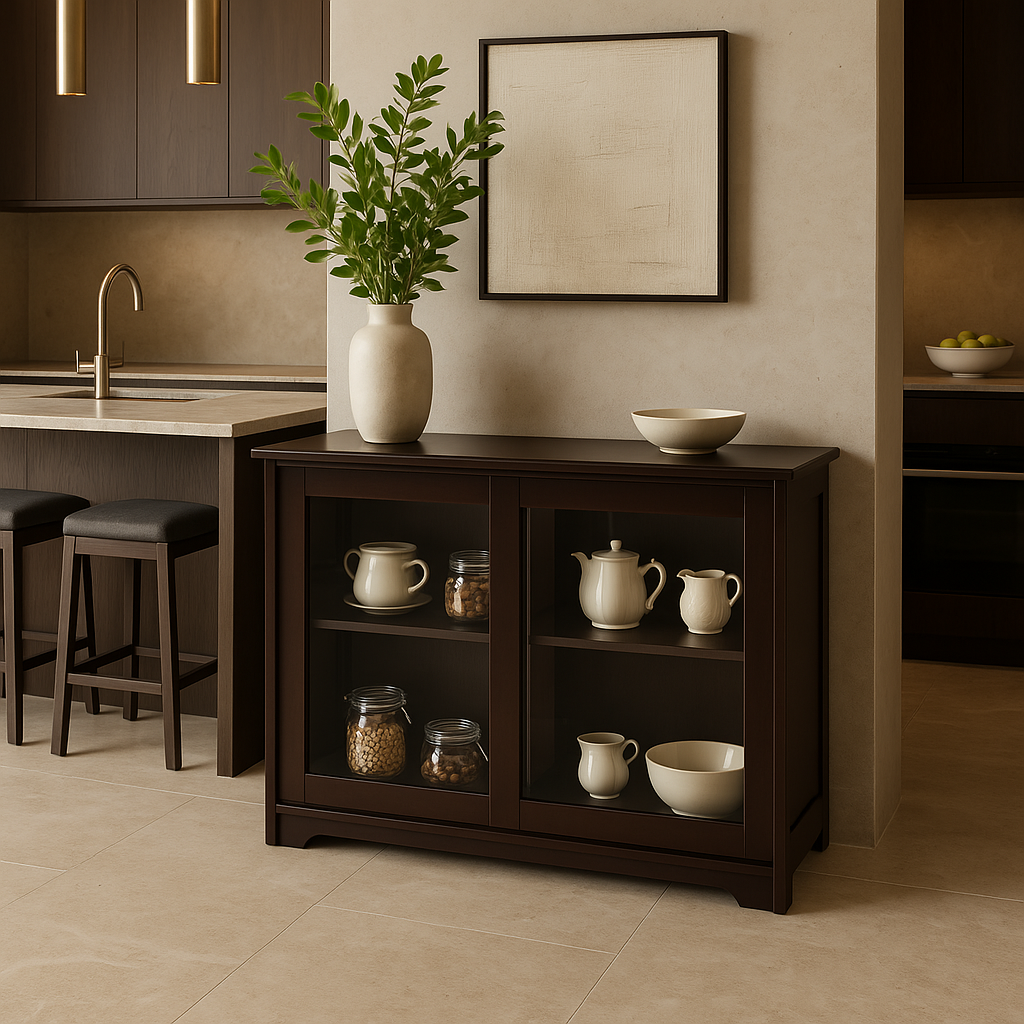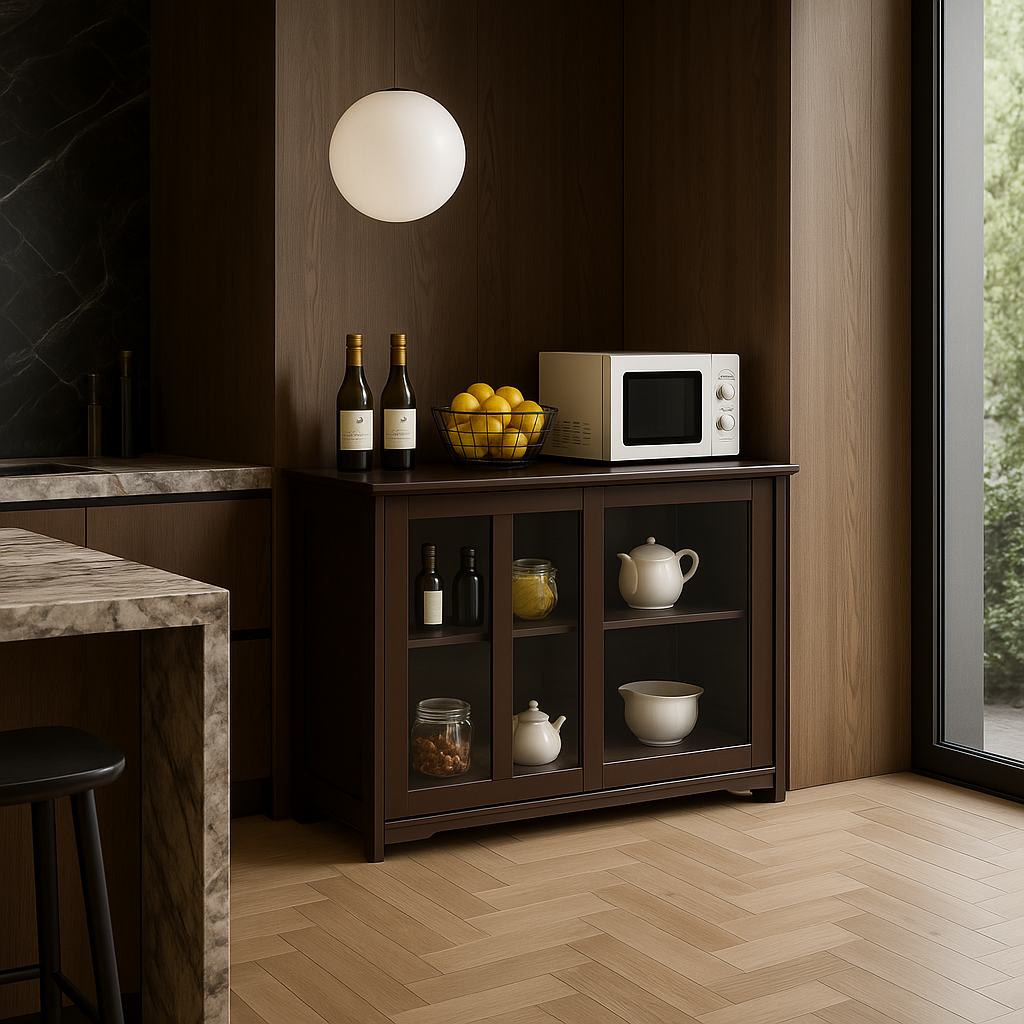 This Bunpeony Pantry Cabinet is a masterpiece of functional design and aesthetic appeal. Its rich brown finish and tempered glass sliding doors create a sophisticated look that complements any kitchen or dining space. The adjustable shelves offer versatility, while the spacious top invites creative styling with decor or kitchen essentials. A perfect blend of practicality and elegance, this cabinet is a must-have for a refined and organized home.