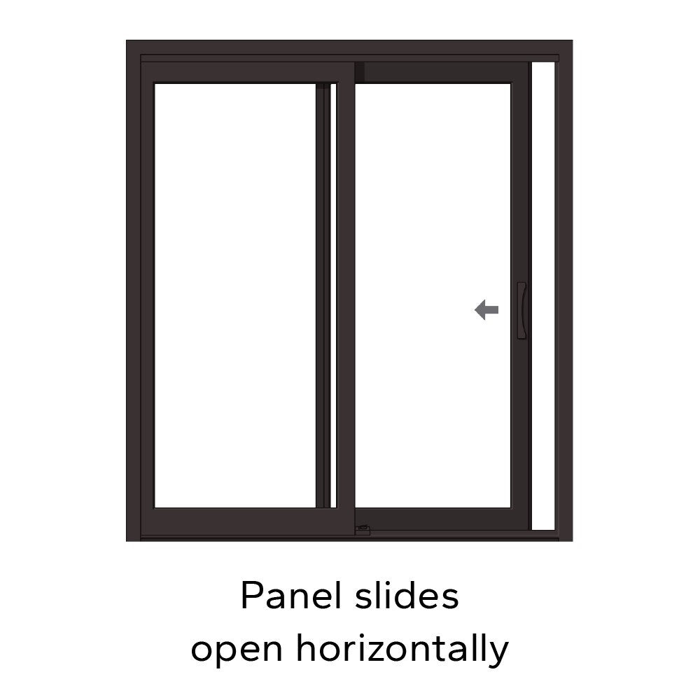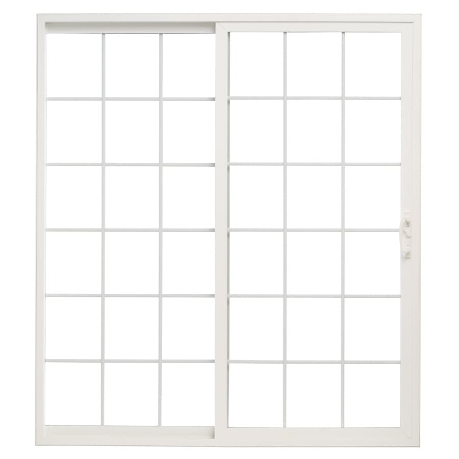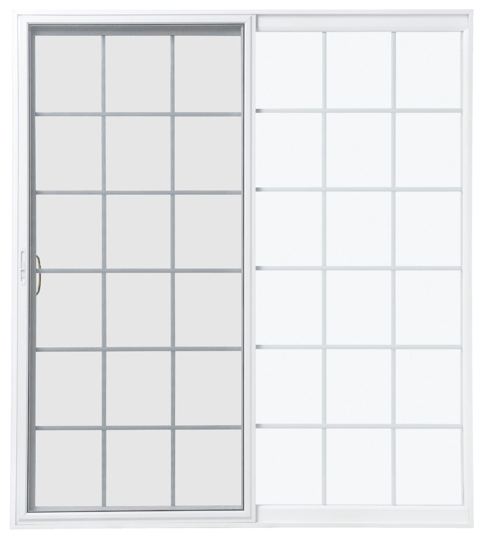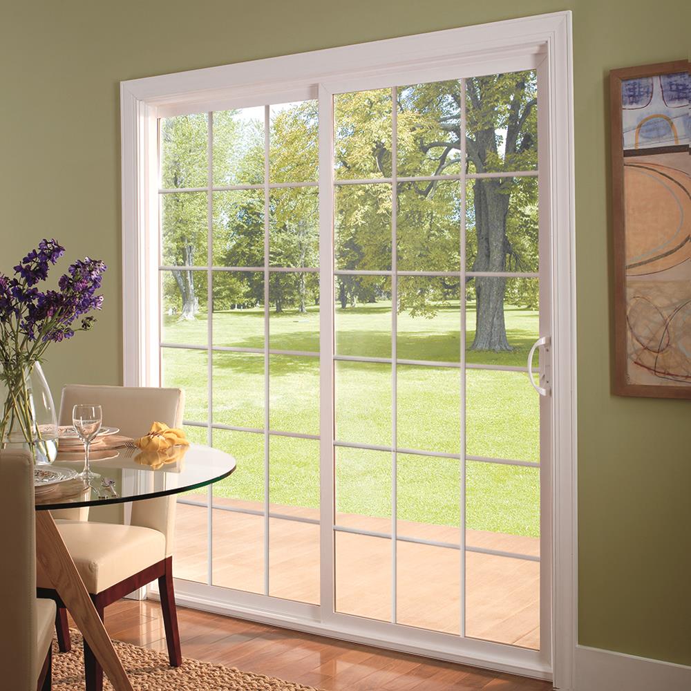 Budget-friendly Pella 150 Series vinyl patio door delivers dependable performance and energy-saving dual-pane Low‑E argon glass. Universal-reversible sliding design with grilles between the glass offers classic style and smooth operation for everyday use.