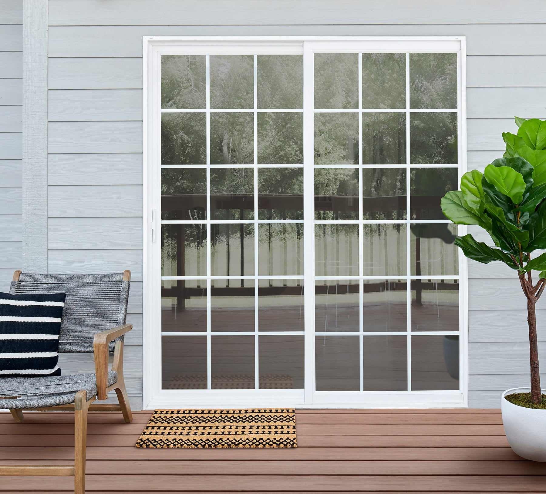 This sliding patio door brings a crisp, tailored rhythm to your room with grilles that echo classic millwork. The slim white vinyl frame feels light and airy, inviting the outdoors in while keeping comfort sealed. Style it with linen drapery and a natural woven rug to accentuate the serene view. A refined essential for luxurious, livable spaces.