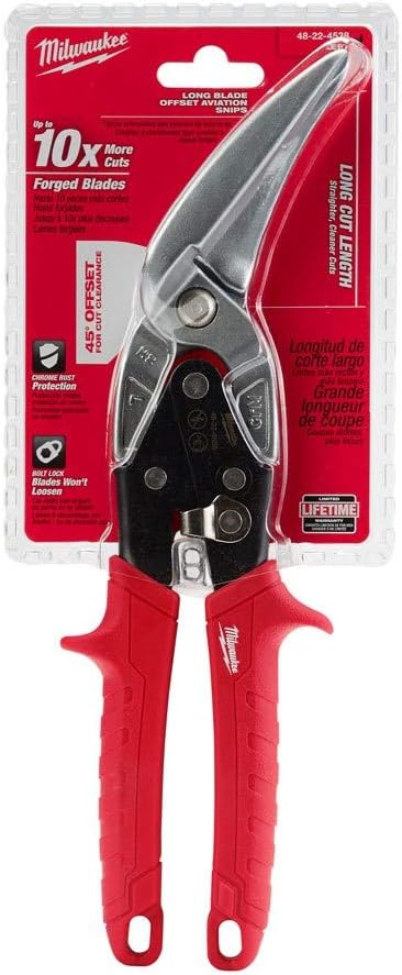 These offset aviation snips bring a refined, industrial clarity to any workspace—sleek chrome blades paired with rich Milwaukee red grips. The long, laser‑hardened cutting edge is the star, gliding through sheet metal with elegant confidence. Style them on a pegboard with brushed steel hooks and charcoal backer for a gallery‑like tool wall. A smart essential, they fuse performance and polish for a truly elevated workshop.