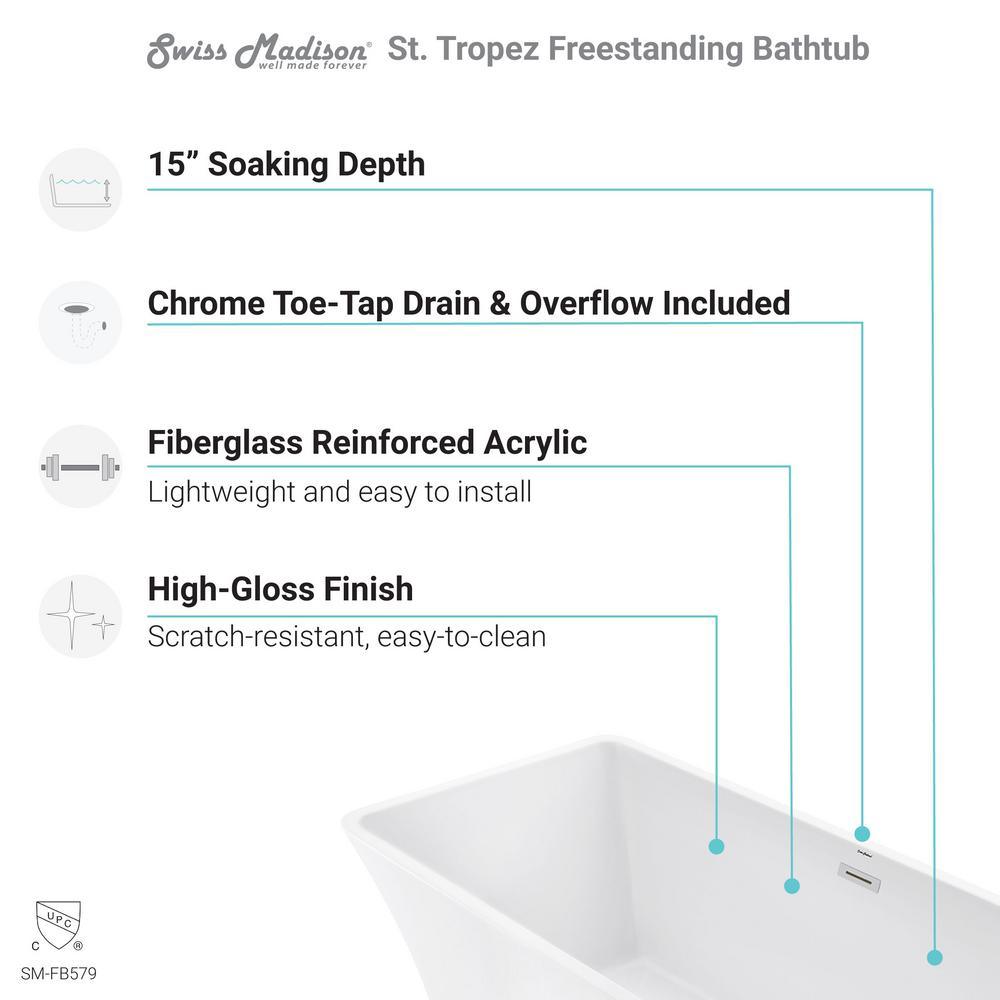 Relax and unwind in an elegant stunning piece of art. The St. Tropez freestanding bathtub offers a striking architectural focal point in your bathroom. Its sloped design offers a deeper soak and extra comfort during your therapeutic bath.