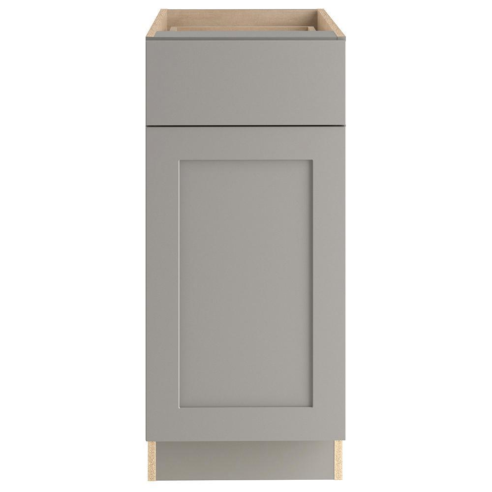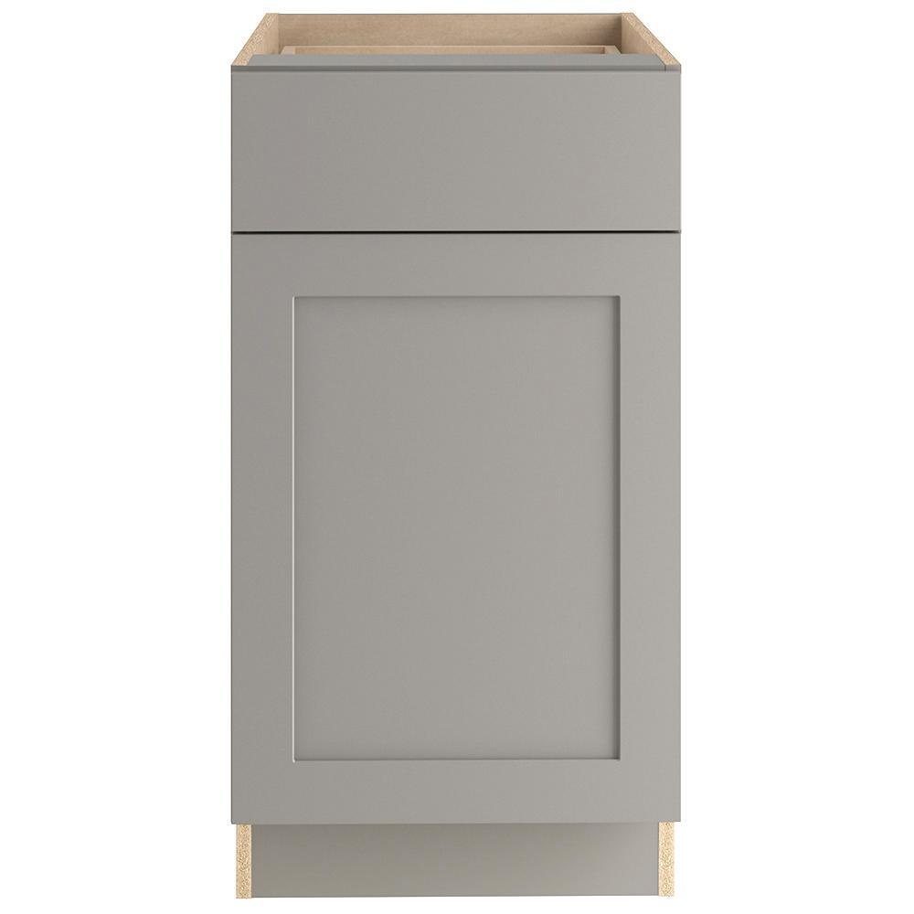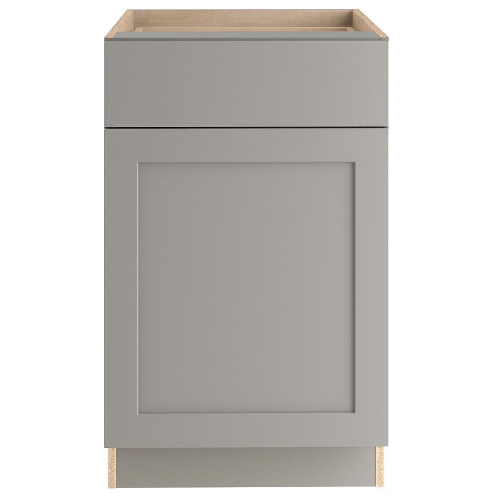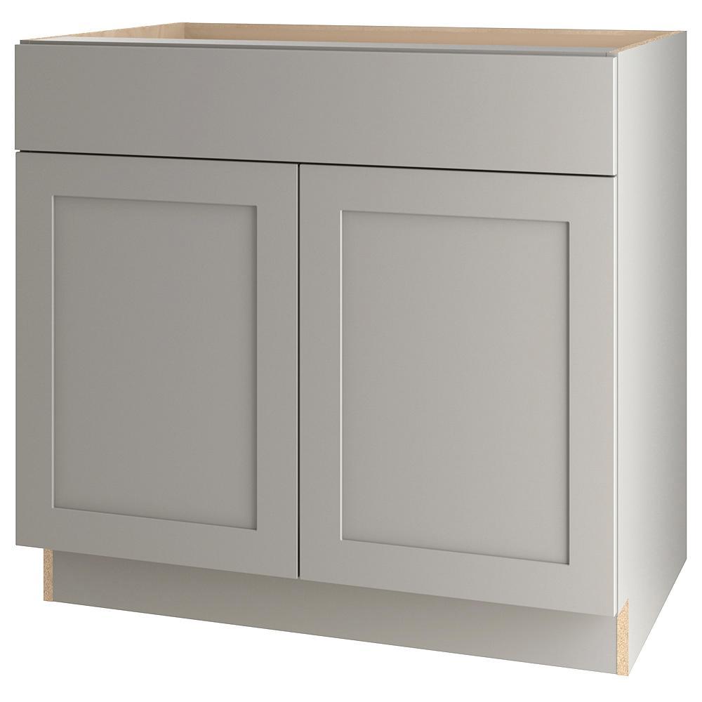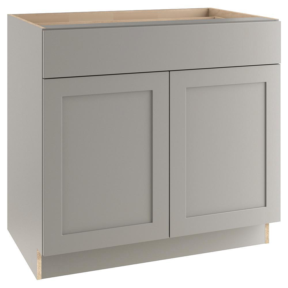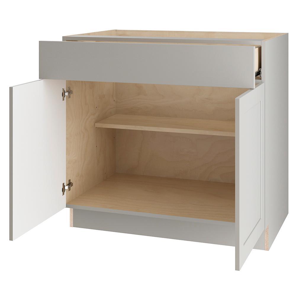 The Edson 36 in. W assembled base cabinet in Gray will withstand the test of time and is beautifully crafted with a slab drawer front and 2 shaker style doors. The Edson collections Gray color offers a taupe-gray finish and laminated natural maple interior that is sure to produce a serene atmosphere. Including a full overlay door style, the base cabinet is fully assembled making it easy for you to build the kitchen, bathroom, laundry room, or office of your dreams.