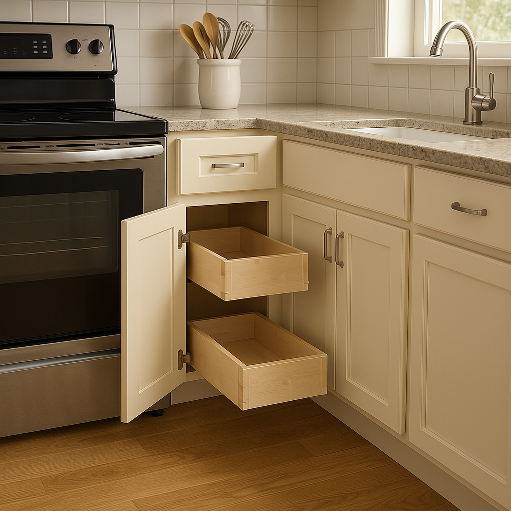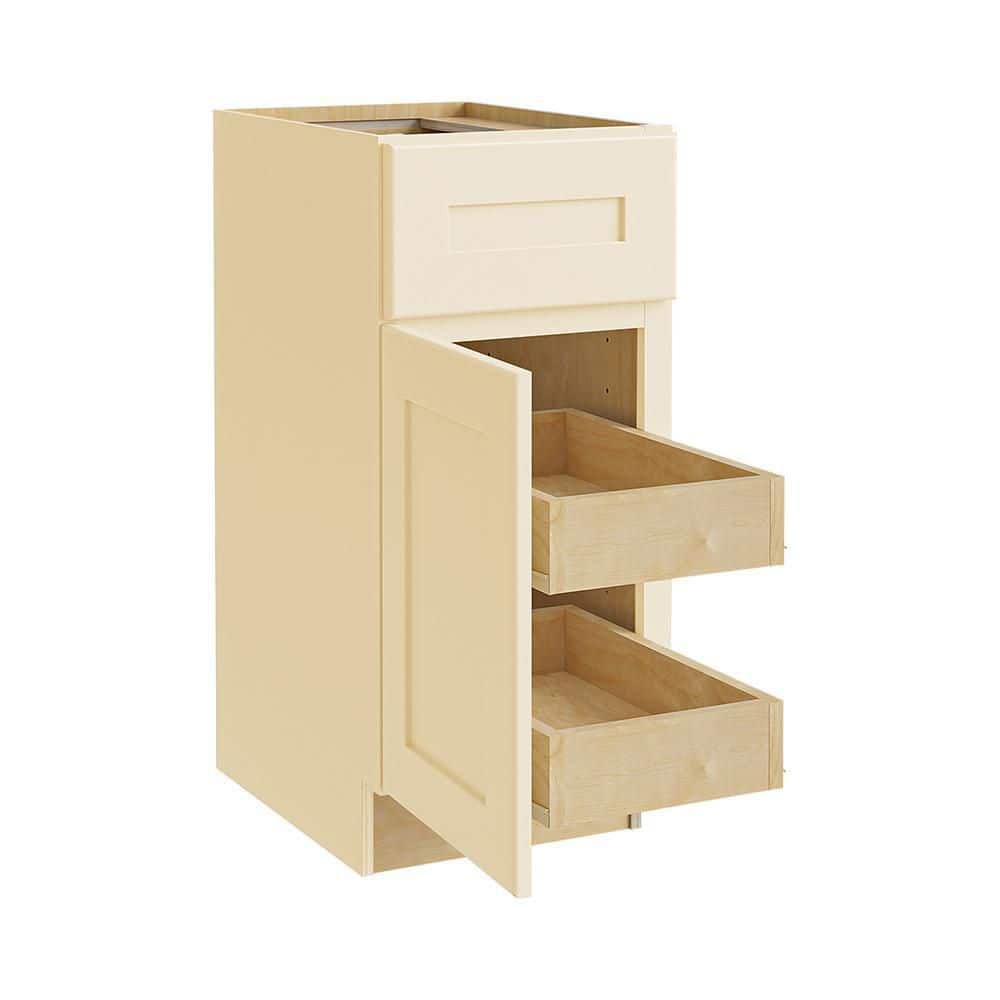 The Newport Base Kitchen Cabinet by Home Decorators Collection combines durable plywood construction with a sophisticated blended cream finish. Featuring soft-close mechanisms and shaker-style doors, it offers both elegance and functionality for modern kitchens.