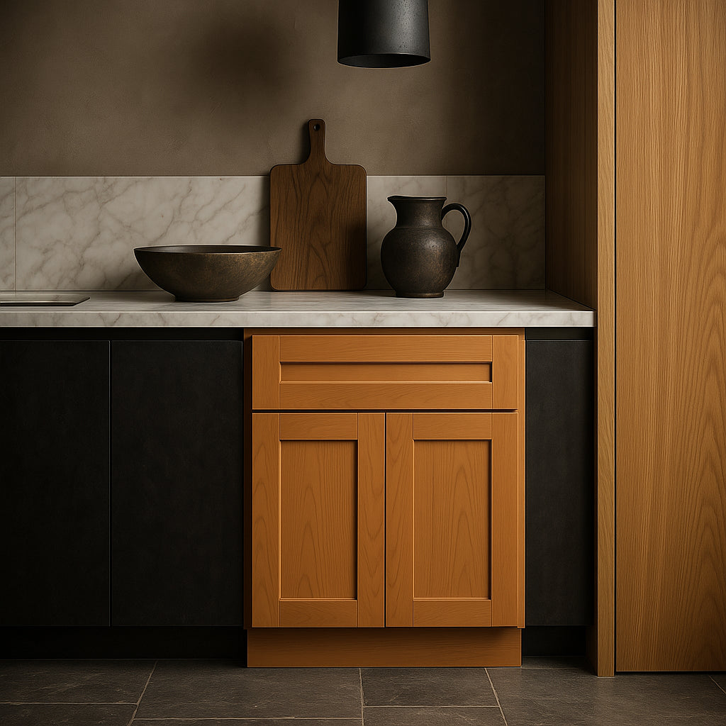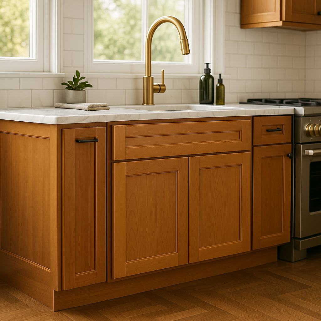 The Newport Cinnamon kitchen cabinet combines Shaker-inspired design with durable all-plywood construction. Featuring soft-close drawers and adjustable shelves, it offers versatile storage and timeless elegance.