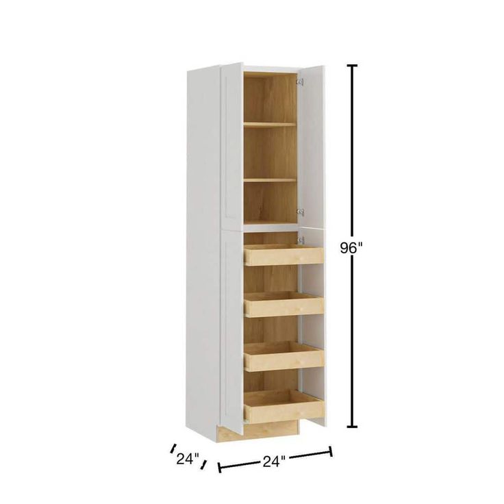 A: The pantry measures 24 inches wide, 24 inches deep, and 96 inches high, optimizing storage with minimal floor space.
