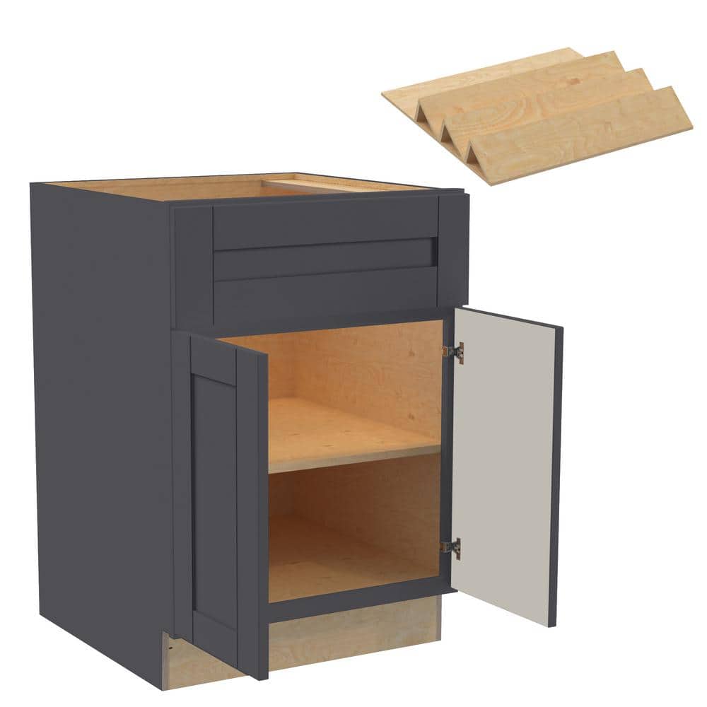 The Washington base kitchen cabinet by Home Decorators Collection combines modern design with practical functionality. Featuring a Valiant Onyx finish, soft-close doors, and adjustable shelves, it offers durability and style for any kitchen.