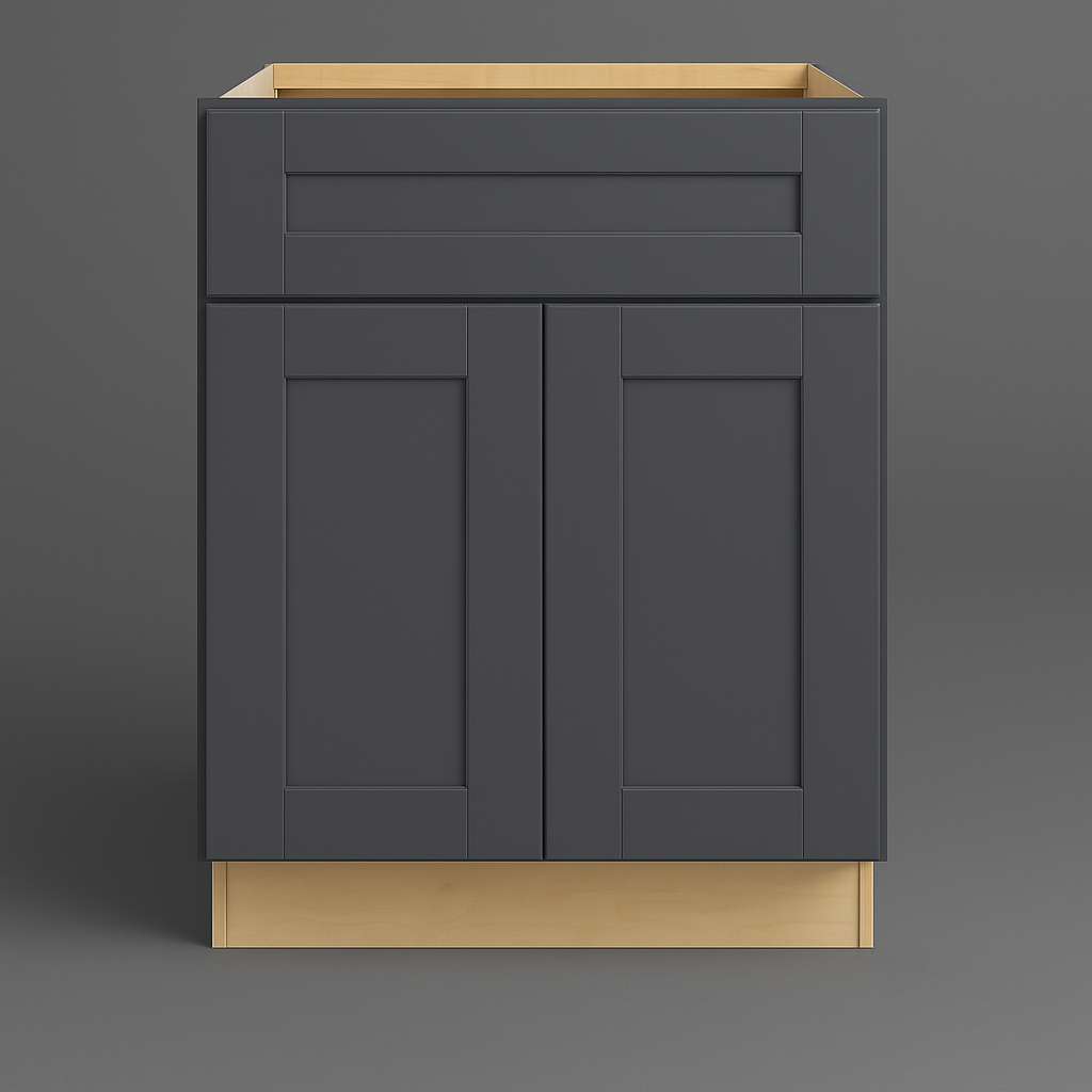 A: The cabinet is made from CARB II compliant plywood with MDF shaker frame doors.