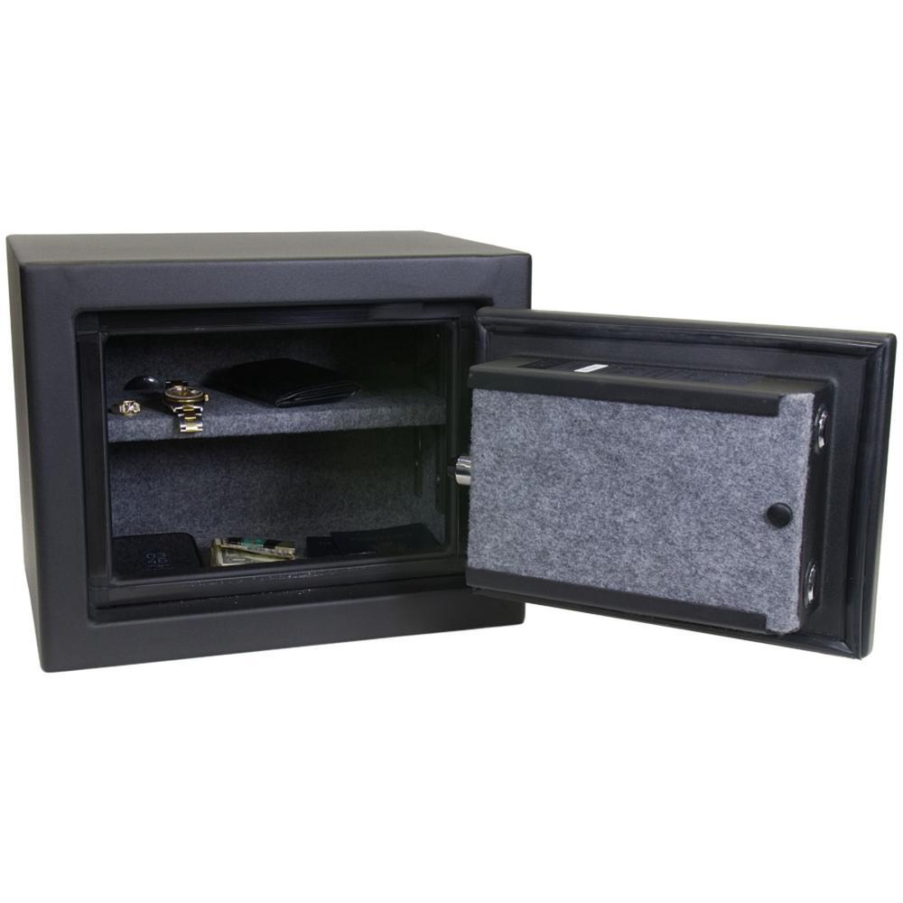 Sports Afield Home and Office Safe SA-ES01 is designed to keep your important personal valuables and documents safe and secure. The programmable electric lock allows for ease of access, while the override key allows for manual entry. The safe is constructed of 14-Gauge steel walls with pry-resistant, recessed doors. Backed by a lifetime, no hassle warranty.