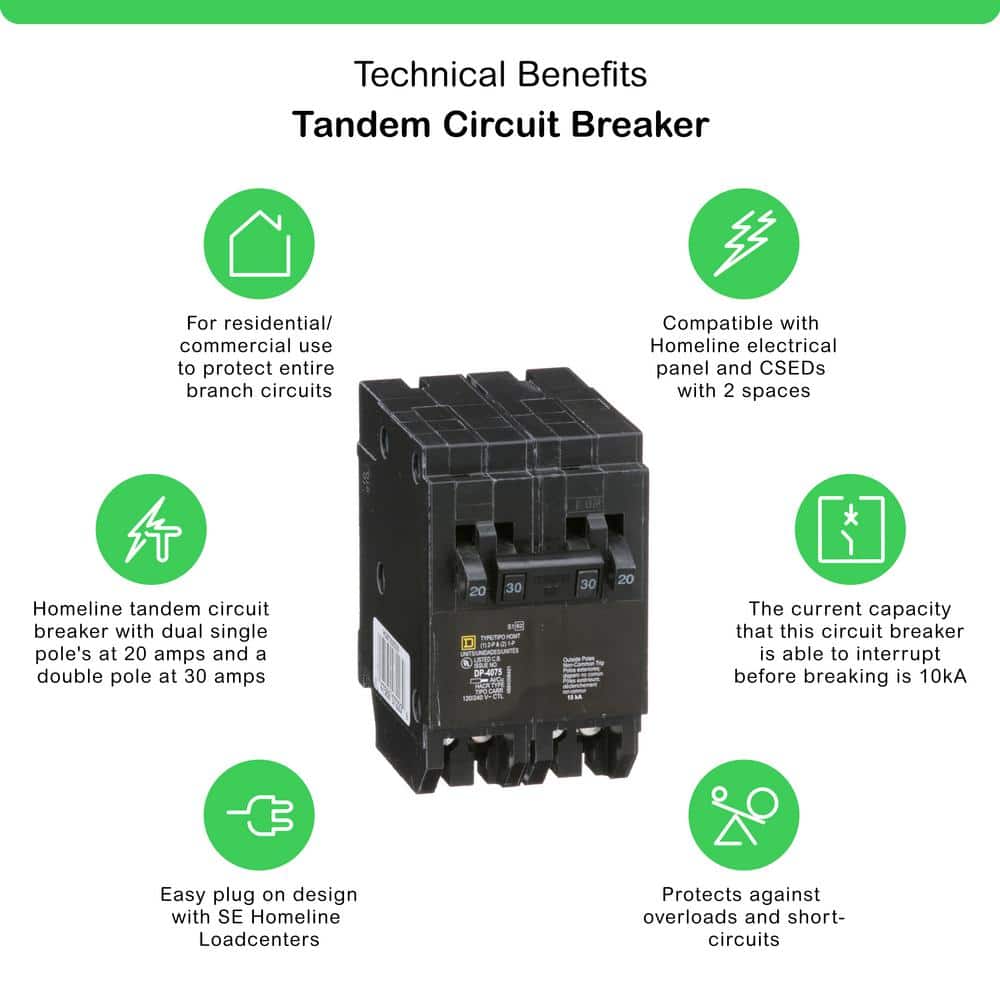 The Square D Homeline Quad Tandem Circuit Breaker is an efficient choice for residential power distribution. Featuring (2) single-pole 20 Amp and (1) double-pole 30 Amp breakers, this unit occupies only two spaces in your panel, offering reliable protection against overloads and short circuits. ANSI-certified and UL-listed, it ensures peace of mind with robust construction and proven Square D quality.