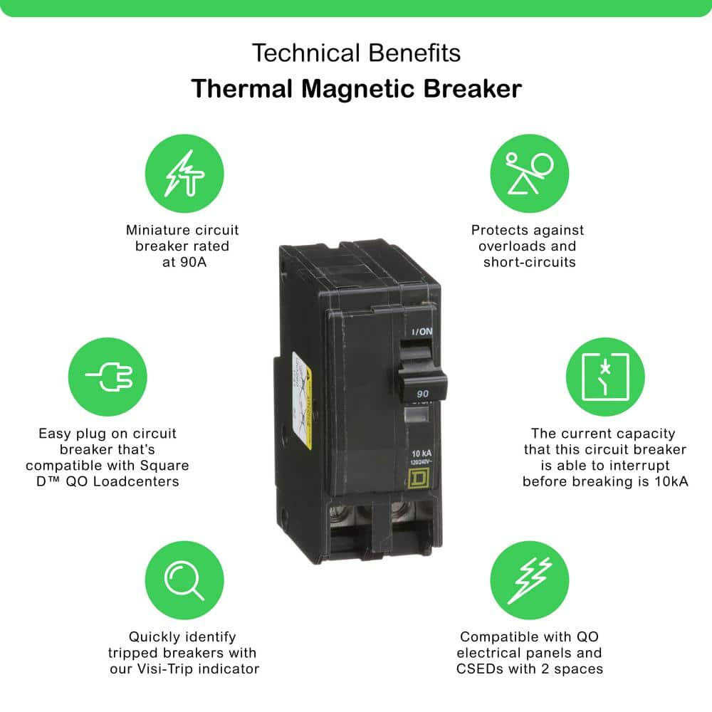 The Square D QO 90 Amp 2-Pole Circuit Breaker provides top-notch protection against overloads and short circuits in your electrical system. With its unique Visi-Trip indicator, quickly identify tripped breakers in any crowded load center. Highly compatible with Square D QO load centers, this circuit breaker is a trusted choice for both professional contractors and DIY enthusiasts.