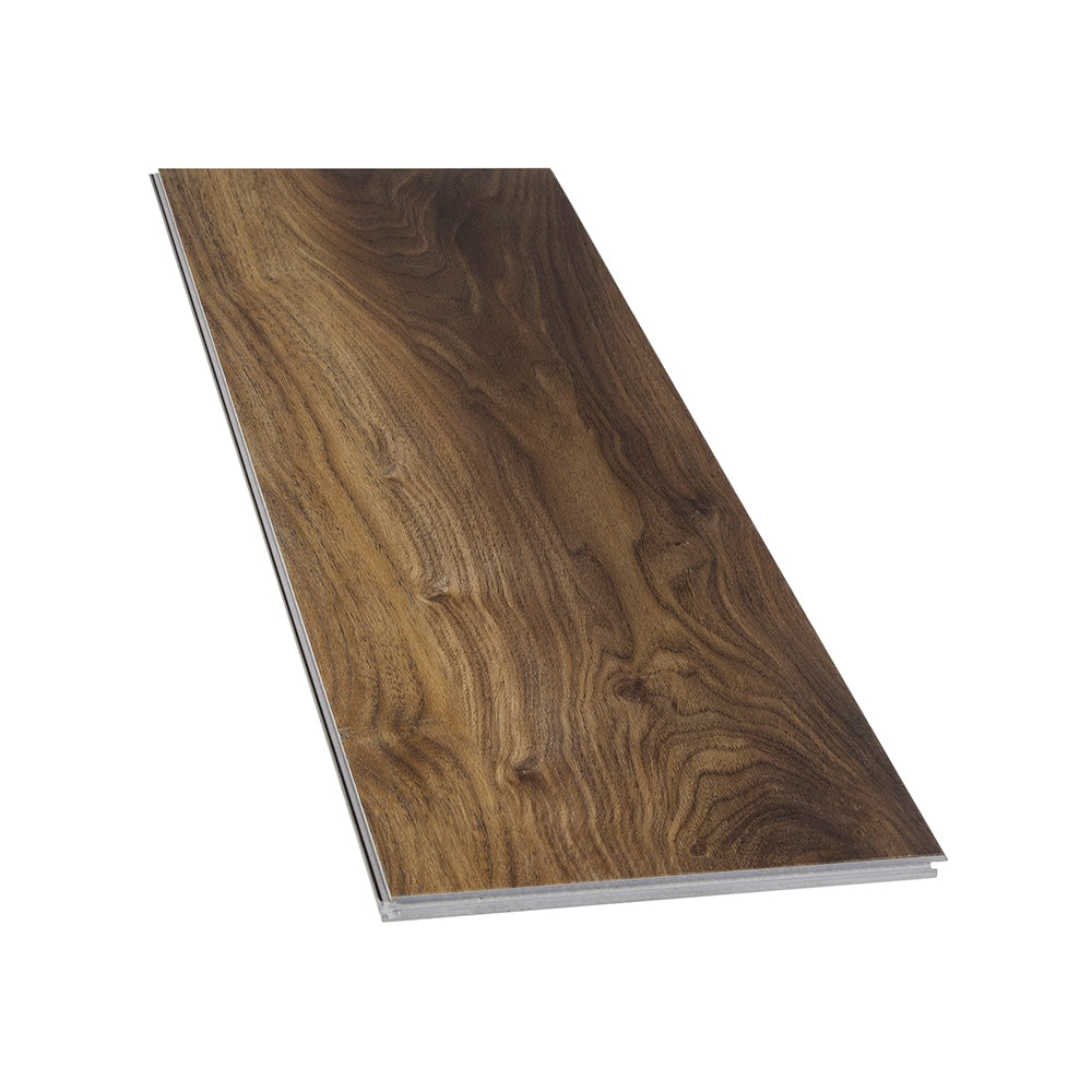 Rigid-core luxury vinyl plank in a rich Highland Walnut look delivers waterproof protection and easy interlocking installation. Pre-attached acoustic underlayment and an abrasion-resistant wear layer make it ideal for busy kitchens, baths, and entryways.