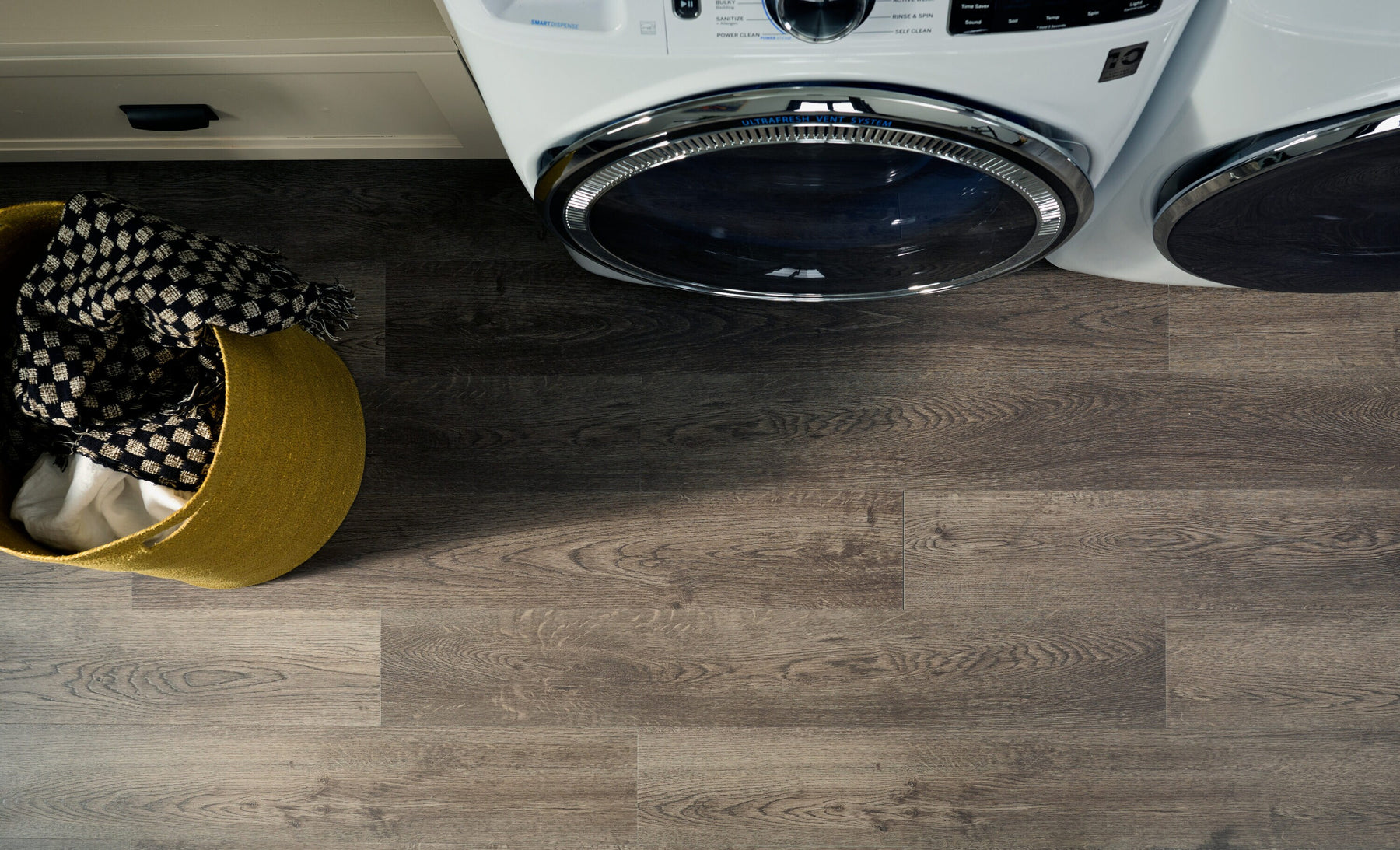 Lockhart Oak’s deep gray palette and EIR texture bring a refined, contemporary calm to utility spaces and open-plan living. The embossed grain adds a tactile richness, echoing natural oak while staying impeccably sleek. Style it with matte black hardware and woven baskets for a chic, functional vibe. It’s the luxe, low-maintenance foundation that stands up beautifully to life with pets.