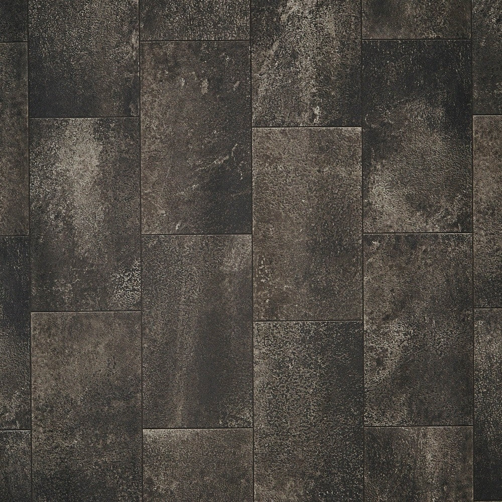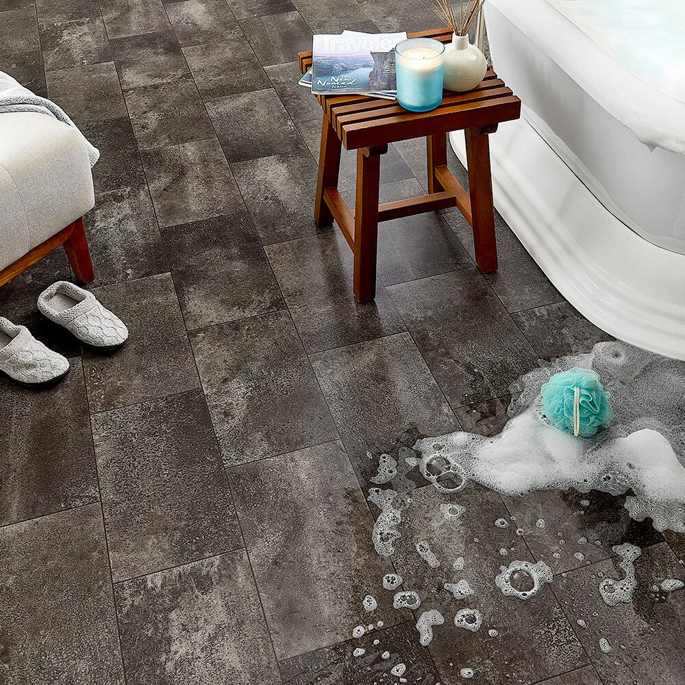 Durable, waterproof sheet vinyl sample in a dark gray stone-inspired wood look, designed for glue-down installation. Built-in antimicrobial properties and a protective wear layer offer easy maintenance and pet-friendly performance for busy homes.