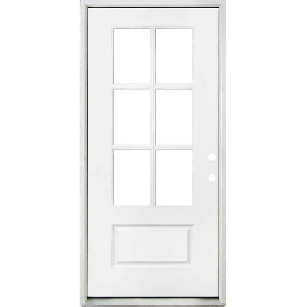 This Steves & Sons Legacy prehung fiberglass front door features six clear, simulated-divided lites in a 3/4 lite layout and a white primed finish ready to paint. Built with a composite frame and Low-E, double-glazed glass, it delivers durability, energy efficiency, and low maintenance for years of smooth operation.