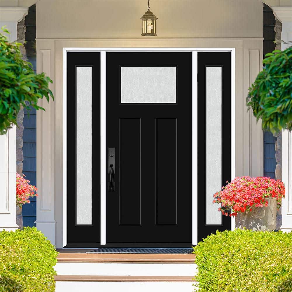 A durable, prehung fiberglass entry door designed for all climates with a composite, rot-free frame. Features rain glass in a 1/4-lite top and dual 12-in sidelites, energy-efficient dual-pane Low-E glass, and bronze ball-bearing hinges for smooth, long-lasting operation.