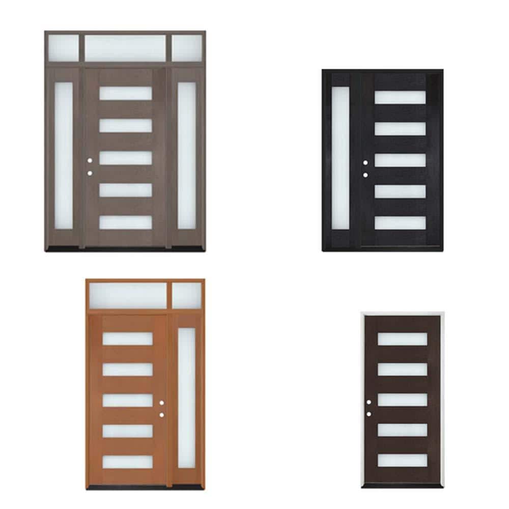This door’s crisp horizontal lites create a rhythmic cadence of light, instantly modernizing the facade. The frosted glass whispers privacy while the richly stained fiberglass frames add tactile depth. Pair it with sleek black hardware and a linear planter to echo its geometry. It’s an elevated, effortless statement for luxurious, everyday living.