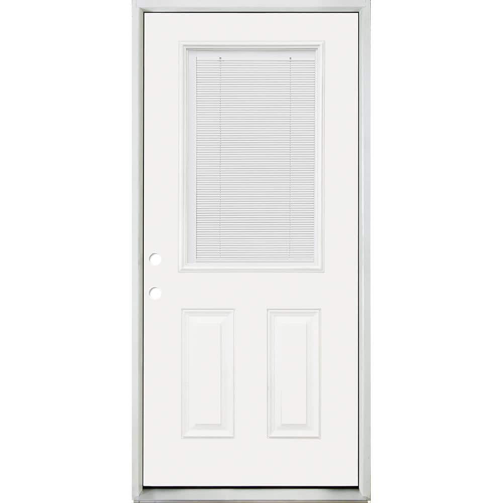 Steves & Sons 32 in. x 80 in. Reliant Clear 1/2 Lite RHIS White Micro-Blind White Primed Fiberglass Prehung Front Door with Nickel Hinges