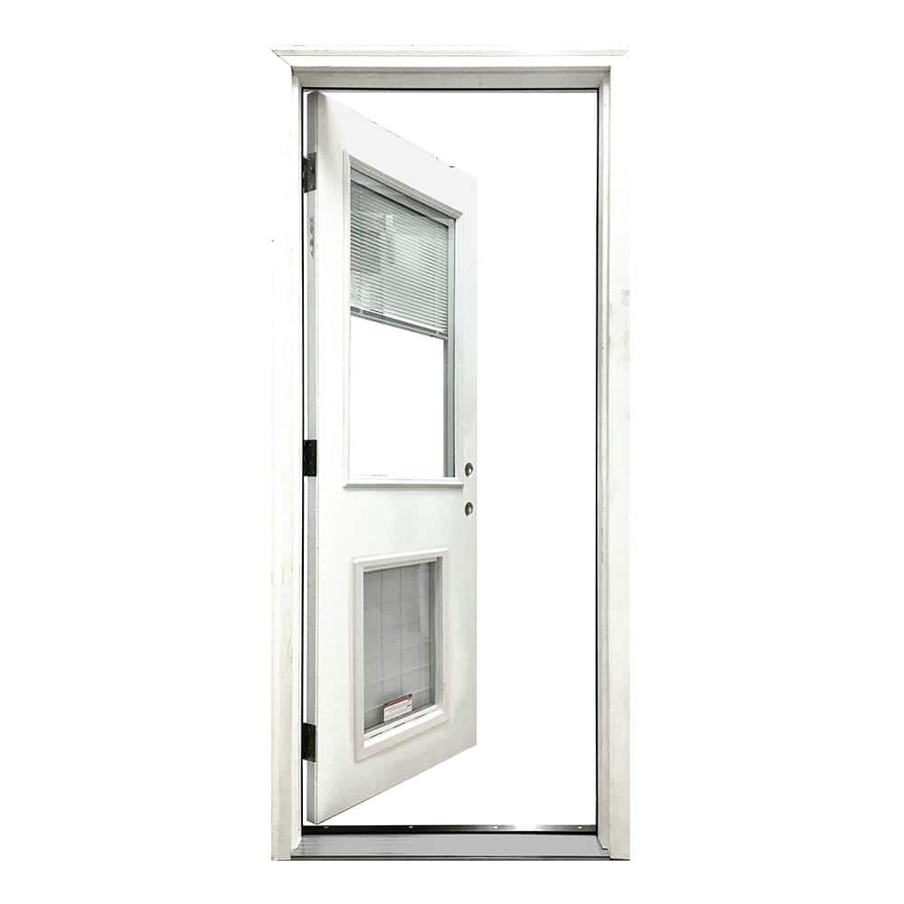 Steves & Sons 32 in. x 80 in. Reliant Series Clear Mini-Blind LHIS White Primed Fiberglass Prehung Front Door with XL Pet Door
